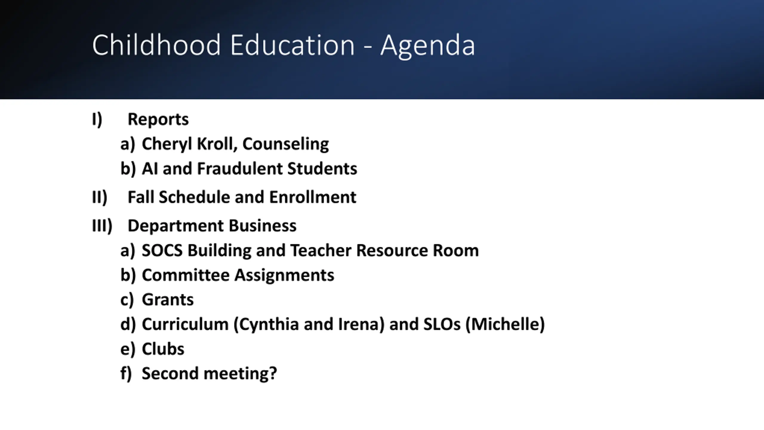 Childhood Education - Agenda I) Reports a) Cheryl Kroll, Counseling b) AI and Fraudulent Students Fall Schedule and Enrollment III) Department Business a) SOCS Building and Teacher Resource Room b) Committee Assignments c) Grants d) Curriculum (Cynthia and Irena) and SLOs (Michelle) e) Clubs f) Second meeting? II)