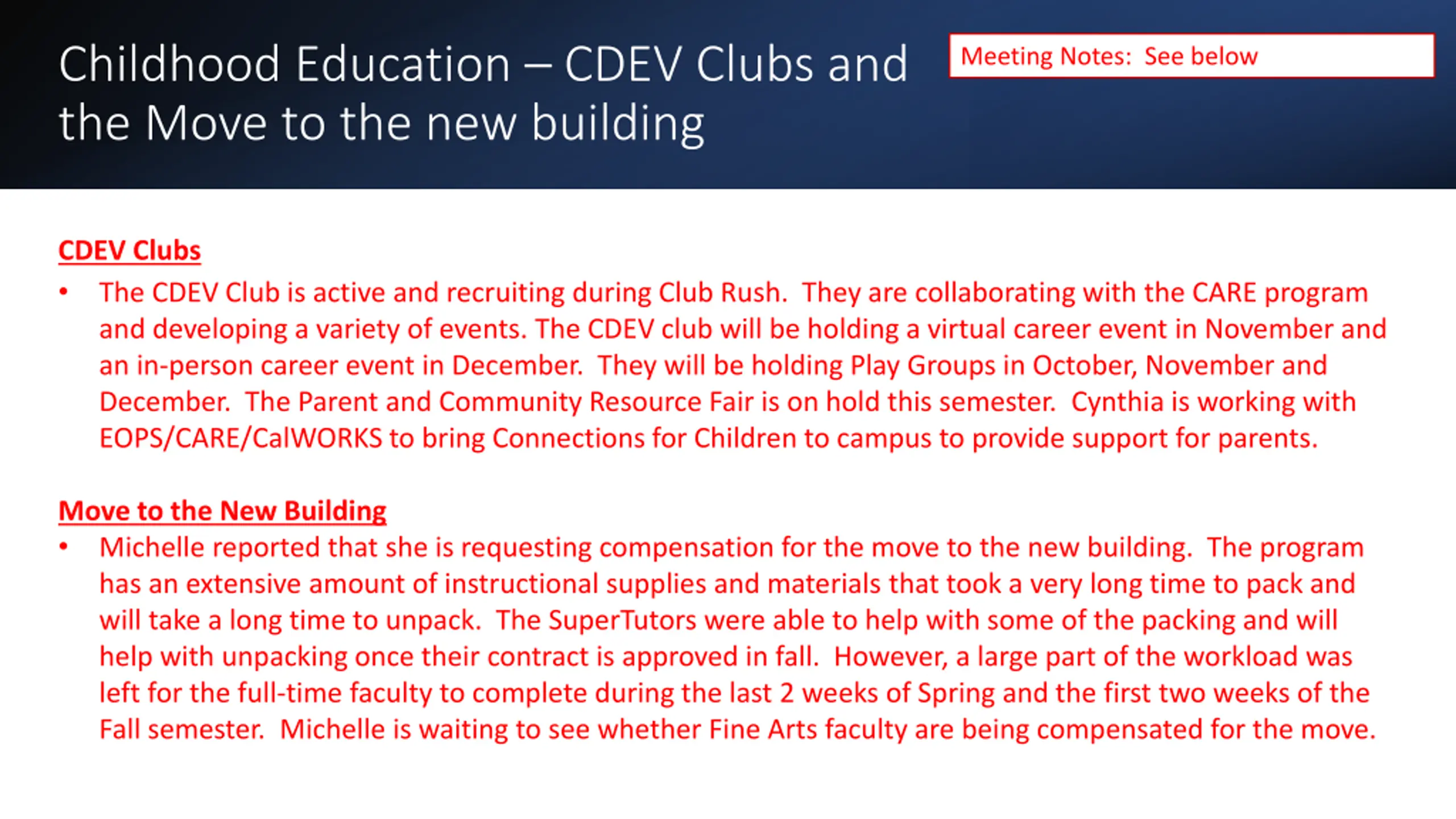 Childhood Education CDEV Clubs and the Move to the new building Meeting Notes: See below CDEV Clubs The CDEV Club is active and recruiting during Club Rush. They are collaborating with the CARE program and developing a variety of events. The CDEV club will be holding a virtual career event in November and an in-person career event in December. They will be holding Play Groups in October, November and December. The Parent and Community Resource Fair is on hold this semester. Cynthia is working with EOPS/CARE/CalWORKS to bring Connections for Children to campus to provide support for parents. Move to the New Building Michelle reported that she is requesting compensation for the move to the new building. The program has an extensive amount of instructional supplies and materials that took a very long time to pack and will take a long time to unpack. The SuperTutors were able to help with some of the packing and will help with unpacking once their contract is approved in fall. However, a large part of the workload was left for the full-time faculty to complete during the last 2 weeks of Spring and the first two weeks of the Fall semester. Michelle is waiting to see whether Fine Arts faculty are being compensated for the move.