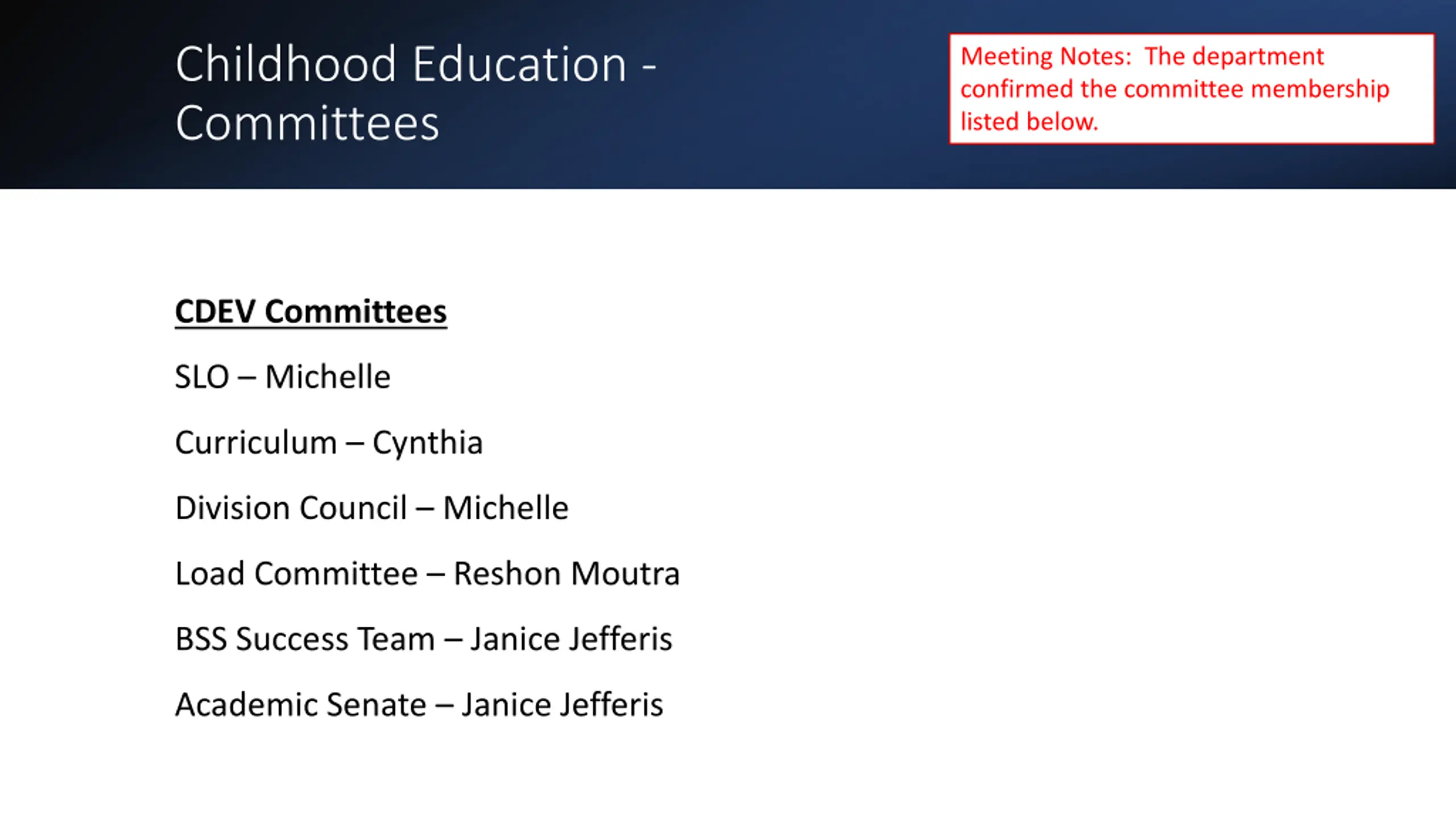 Childhood Education - Committees Meeting Notes: The department confirmed the committee membership listed below. CDEV Committees SLO Michelle Curriculum Cynthia Division Council Michelle Load Committee Reshon Moutra BSS Success Team Janice Jefferis Academic Senate Janice Jefferis