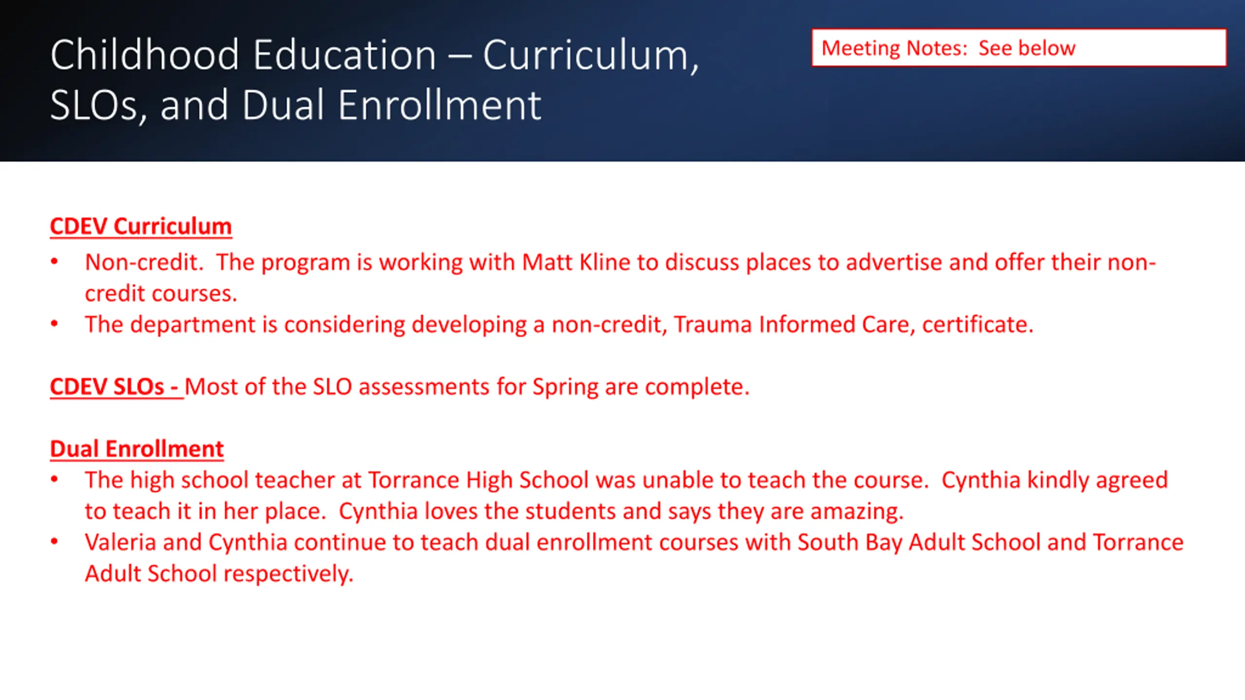 Childhood Education Curriculum, SLOs, and Dual Enrollment Meeting Notes: See below CDEV Curriculum Non-credit. The program is working with Matt Kline to discuss places to advertise and offer their non- credit courses. The department is considering developing a non-credit, Trauma Informed Care, certificate. CDEV SLOs - Most of the SLO assessments for Spring are complete. Dual Enrollment The high school teacher at Torrance High School was unable to teach the course. Cynthia kindly agreed to teach it in her place. Cynthia loves the students and says they are amazing. Valeria and Cynthia continue to teach dual enrollment courses with South Bay Adult School and Torrance Adult School respectively.