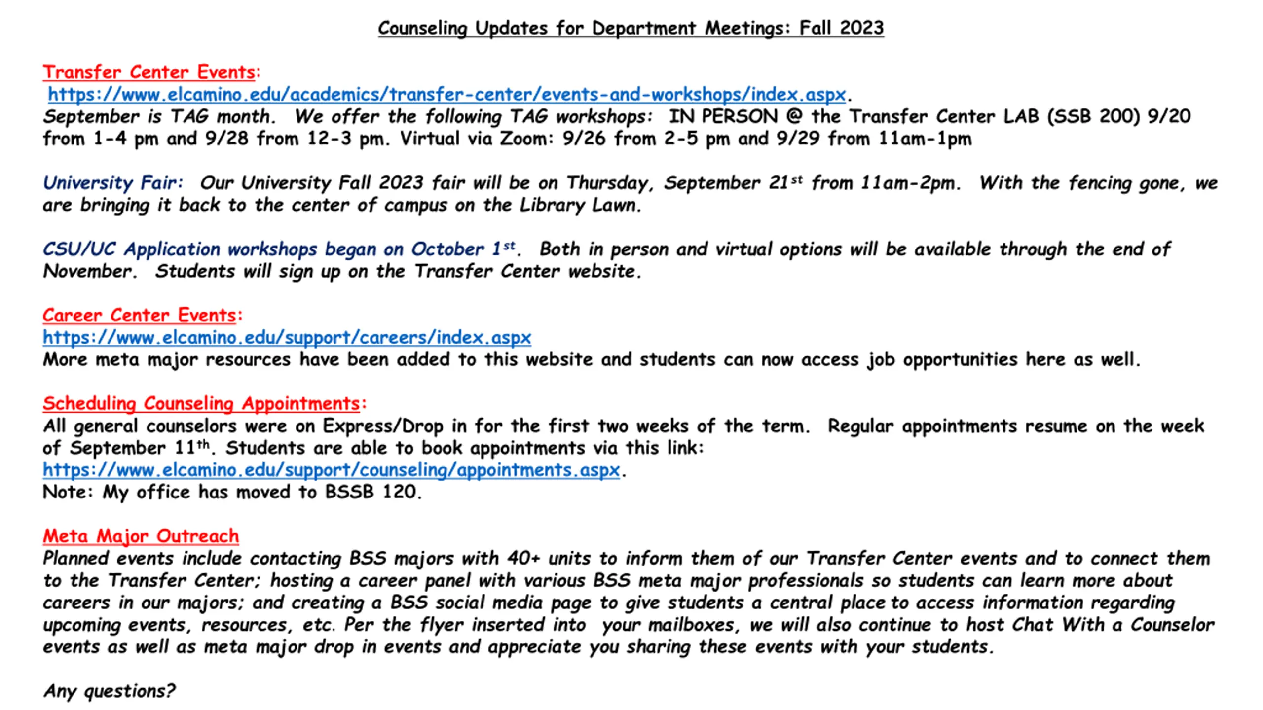 Counseling Updates for Department Meetings: Fall 2023 Transfer Center Events: https://www.elcamino.edu/academics/transfer-center/events-and-workshops/index.aspx. September is TAG month. We offer the following TAG workshops: IN PERSON @ the Transfer Center LAB (SSB 200) 9/20 from 1-4 pm and 9/28 from 12-3 pm. Virtual via Zoom: 9/26 from 2-5 pm and 9/29 from 11am-1pm University Fair: Our University Fall 2023 fair will be on Thursday, September 21stfrom 11am-2pm. With the fencing gone, we are bringing it back to the center of campus on the Library Lawn. CSU/UC Application workshops began on October 1st. Both in person and virtual options will be available through the end of November. Students will sign up on the Transfer Center website. Career Center Events: https://www.elcamino.edu/support/careers/index.aspx More meta major resources have been added to this website and students can now access job opportunities here as well. Scheduling Counseling Appointments: All general counselors were on Express/Drop in for the first two weeks of the term. Regular appointments resume on the week of September 11th. Students are able to book appointments via this link: https://www.elcamino.edu/support/counseling/appointments.aspx. Note: My office has moved to BSSB 120. Meta Major Outreach Planned events include contacting BSS majors with 40+ units to inform them of our Transfer Center events and to connect them to the Transfer Center; hosting a career panel with various BSS meta major professionals so students can learn more about careers in our majors; and creating a BSS social media page to give students a central placeto access information regarding upcoming events, resources, etc. Per the flyer inserted into your mailboxes, we will also continue to host Chat With a Counselor events as well as meta major drop in events and appreciate you sharing these events with your students. Any questions?