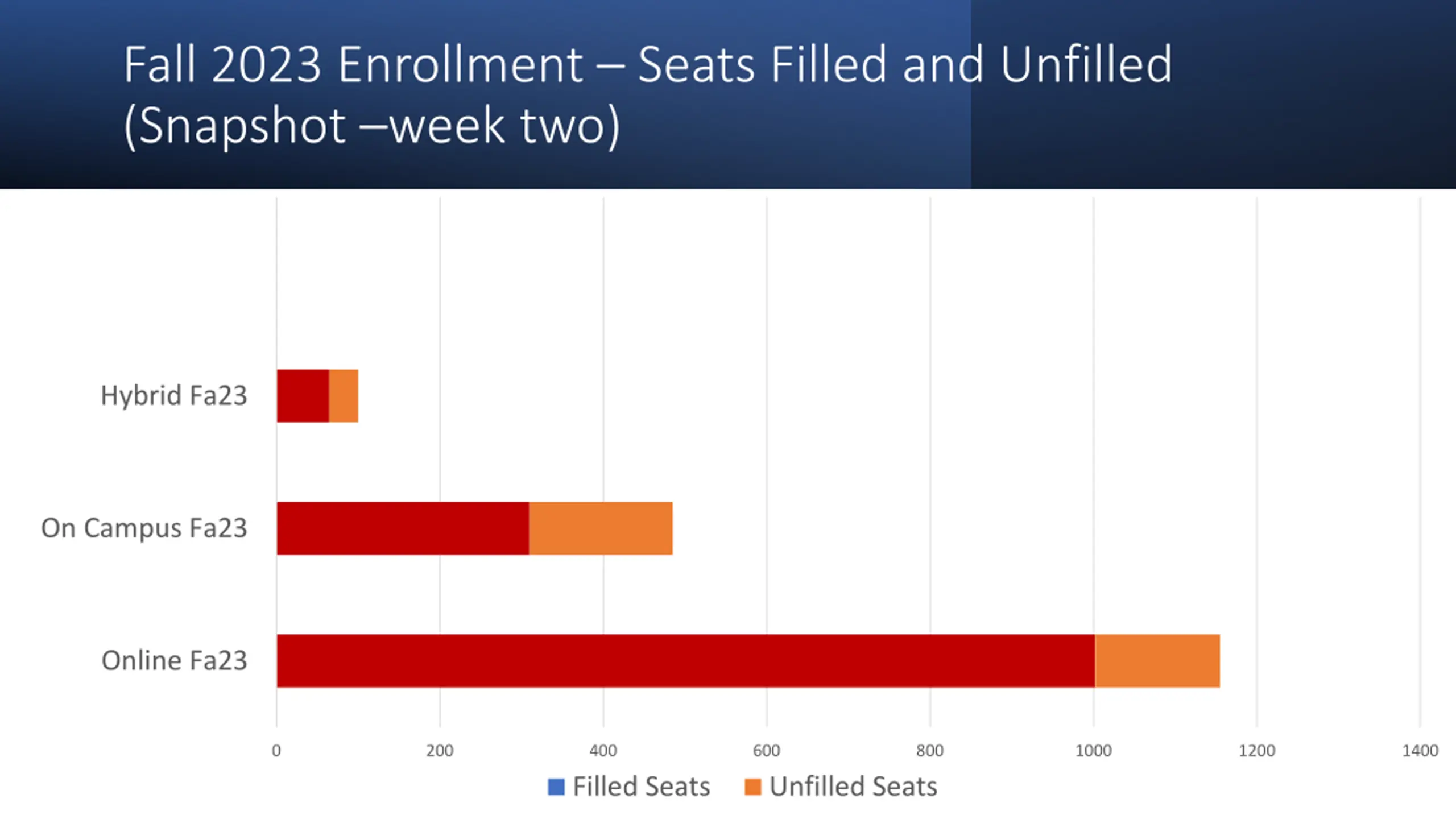 Fall 2023 Enrollment Seats Filled and Unfilled (Snapshot week two) Hybrid Fa23 On Campus Fa23 Online Fa23 0 200 400 600 800 1000 1200 1400 Filled Seats Unfilled Seats