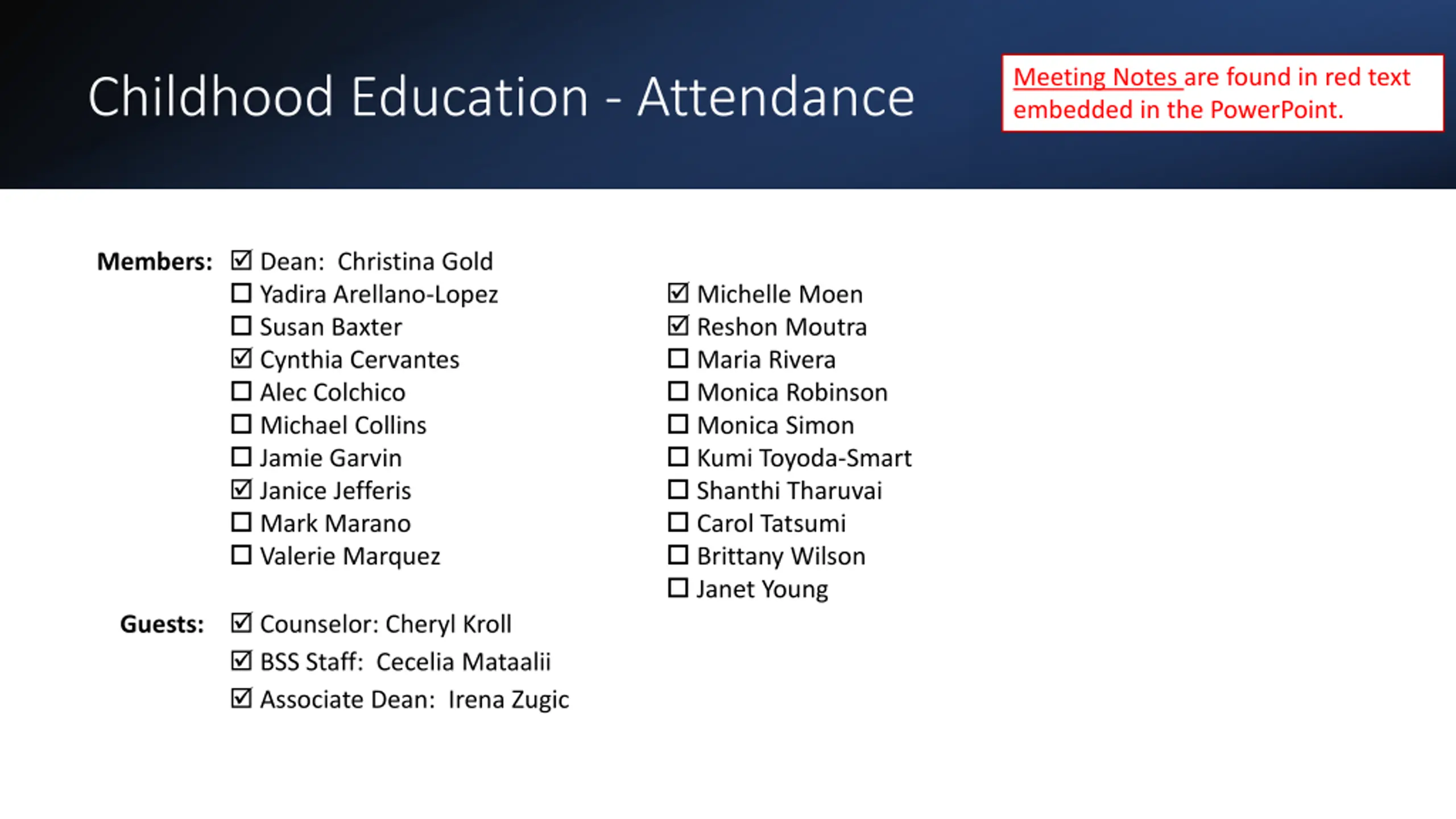 Meeting Notes are found in red text embedded in the PowerPoint. Childhood Education - Attendance Members: Dean: Christina Gold Yadira Arellano-Lopez Susan Baxter Cynthia Cervantes Alec Colchico Michael Collins Jamie Garvin Janice Jefferis Mark Marano Valerie Marquez Guests: Counselor: Cheryl Kroll BSS Staff: Cecelia Mataalii Associate Dean: Irena Zugic Michelle Moen Reshon Moutra Maria Rivera Monica Robinson Monica Simon Kumi Toyoda-Smart Shanthi Tharuvai Carol Tatsumi Brittany Wilson Janet Young