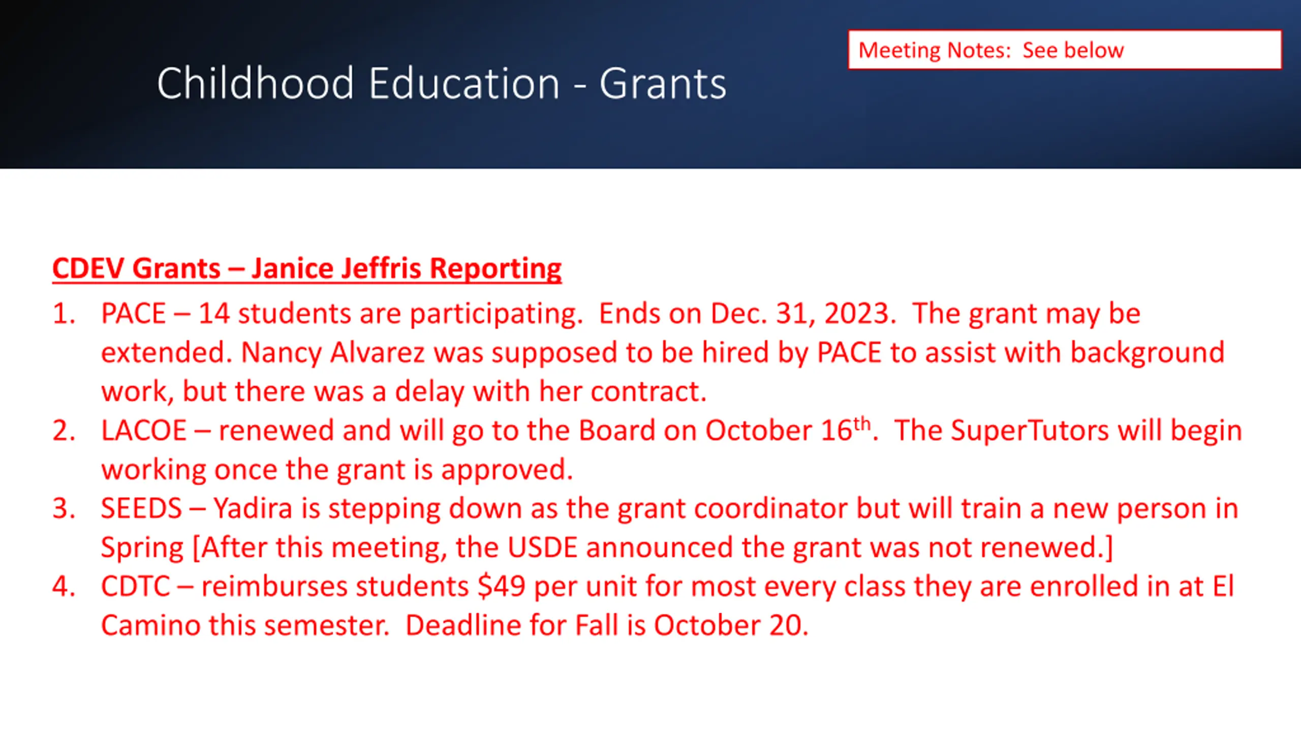 Meeting Notes: See below Childhood Education - Grants CDEV Grants Janice Jeffris Reporting 1. PACE 14 students are participating. Ends on Dec. 31, 2023. The grant may be extended. Nancy Alvarez was supposed to be hired by PACE to assist with background work, but there was a delay with her contract. 2. LACOE renewed and will go to the Board on October 16th. The SuperTutors will begin working once the grant is approved. 3. SEEDS Yadira is stepping down as the grant coordinator but will train a new person in Spring [After this meeting, the USDE announced the grant was not renewed.] 4. CDTC reimburses students $49 per unit for most every class they are enrolled in at El Camino this semester. Deadline for Fall is October 20.