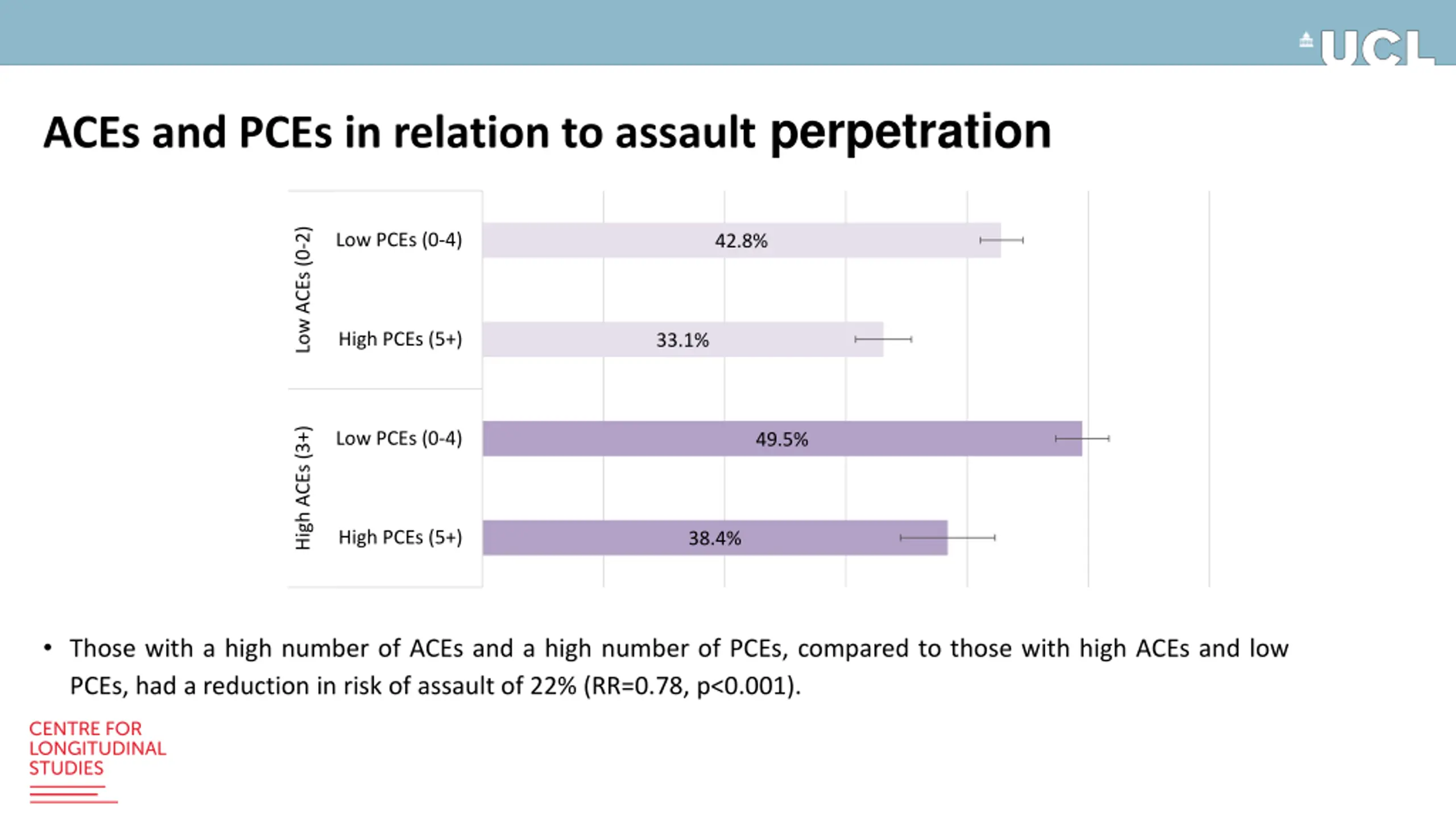 ACEs and PCEs in relation to assault perpetration Low ACEs (0-2) Low PCEs (0-4) 42.8% High PCEs (5+) 33.1% High ACEs (3+) Low PCEs (0-4) 49.5% High PCEs (5+) 38.4% Those with a high number of ACEs and a high number of PCEs, compared to those with high ACEs and low PCEs, had a reduction in risk of assault of 22% (RR=0.78, p<0.001).