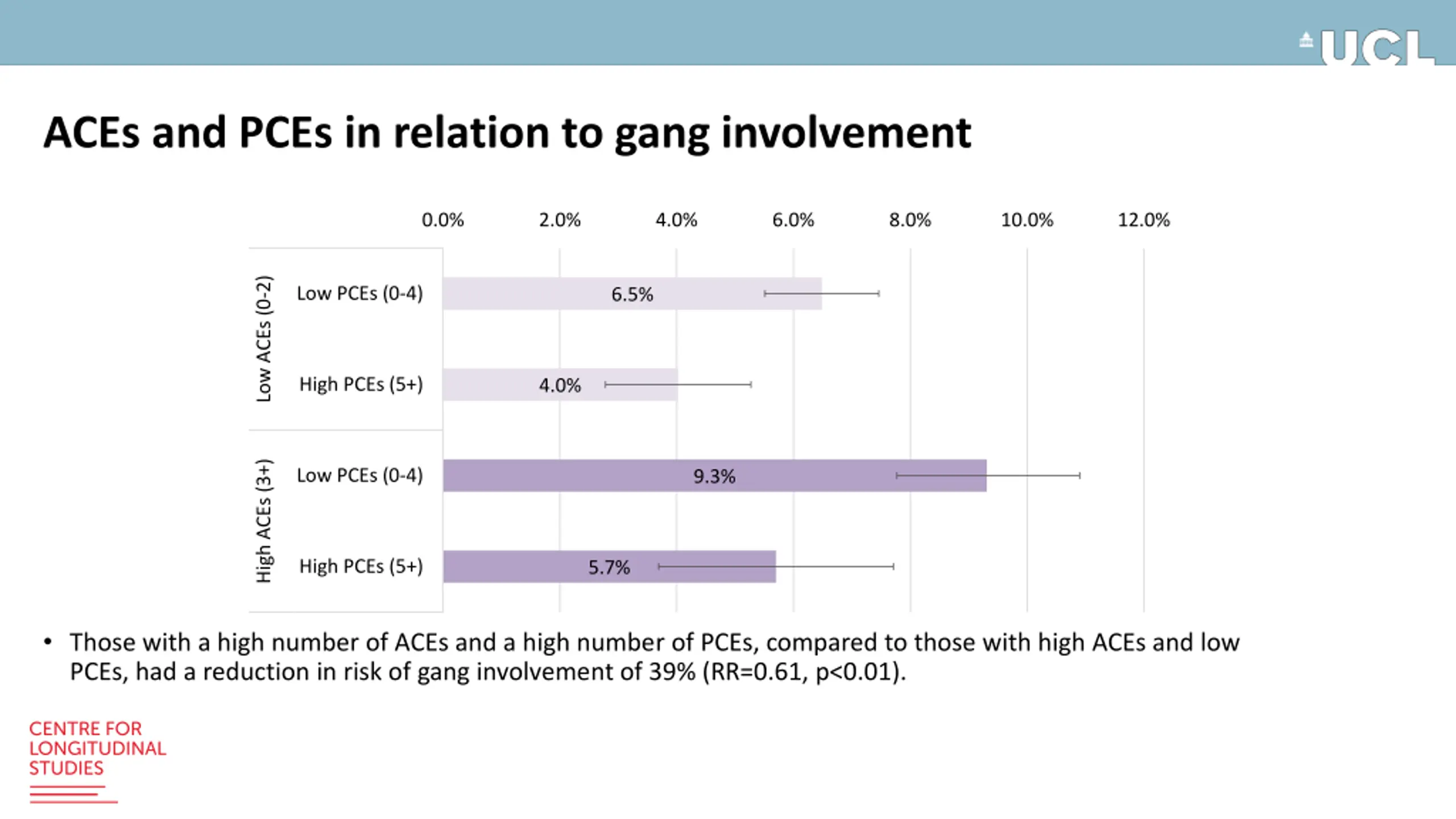 ACEs and PCEs in relation to gang involvement 0.0% 2.0% 4.0% 6.0% 8.0% 10.0% 12.0% Low ACEs (0-2) Low PCEs (0-4) 6.5% High PCEs (5+) 4.0% High ACEs (3+) Low PCEs (0-4) 9.3% High PCEs (5+) 5.7% Those with a high number of ACEs and a high number of PCEs, compared to those with high ACEs and low PCEs, had a reduction in risk of gang involvement of 39% (RR=0.61, p<0.01).