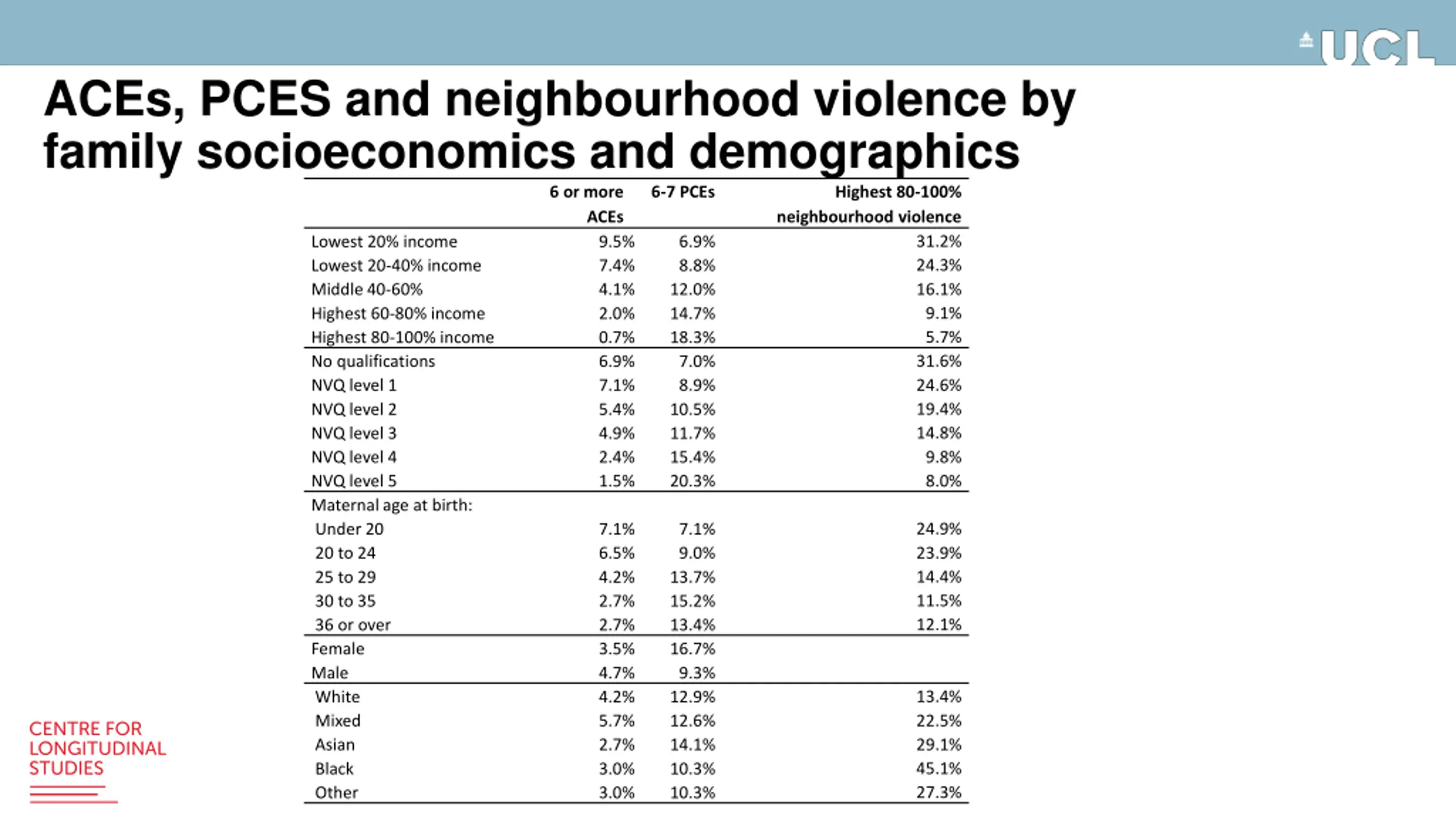 Plans for further research on ACEs and PCES Using the MCS cohort study to examine a broad range of important outcomes in adolescence (age 17) and young adulthood (age 23 data available soon-ish) Mental health Physical health Substance use Education Employment Huge thanks for funding from YEF to develop ACEs and PCEs frameworks in the MCS of immense value to a broader field of social research