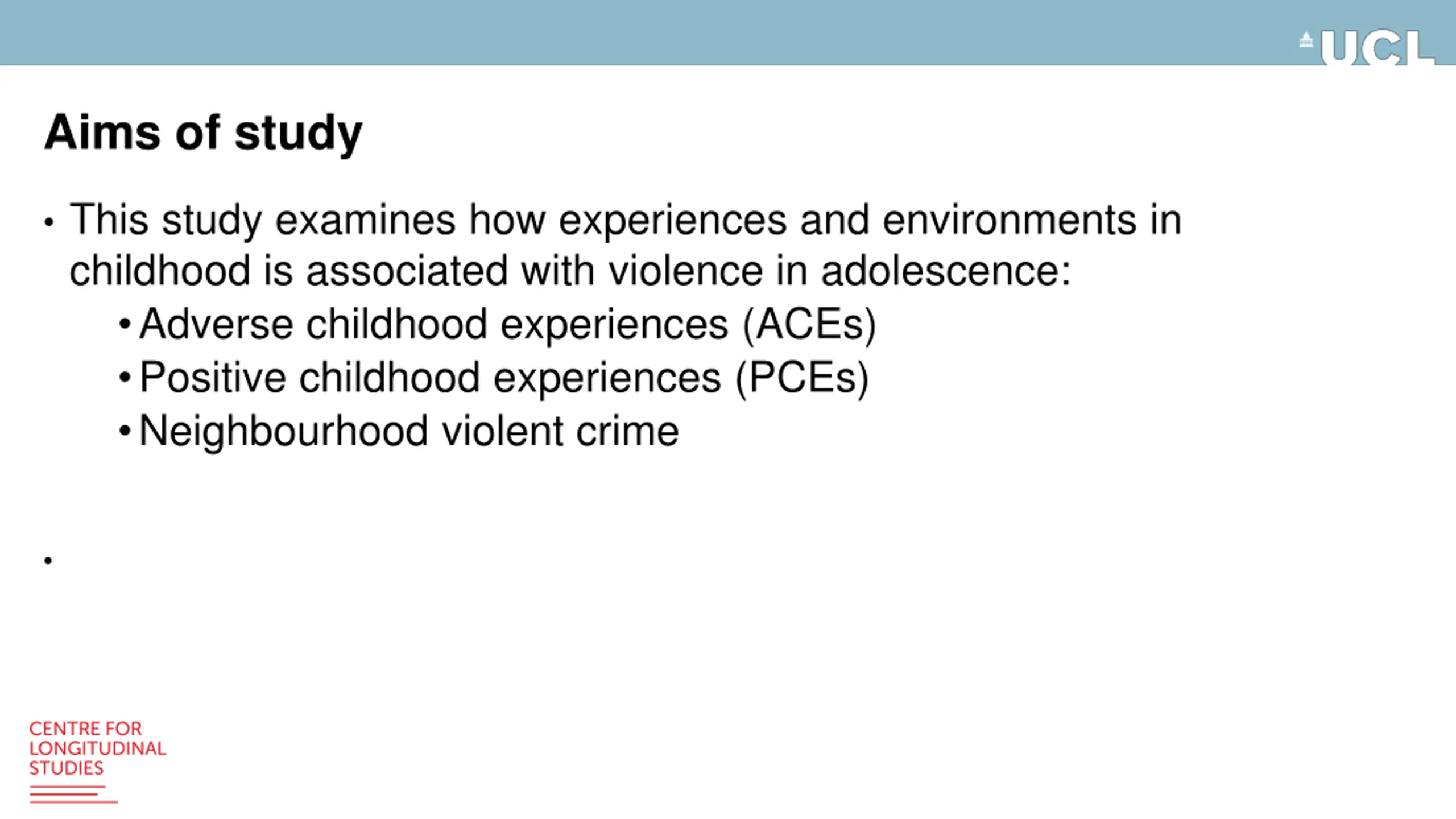 Aims of study This study examines how experiences and environments in childhood is associated with violence in adolescence: Adverse childhood experiences (ACEs) Positive childhood experiences (PCEs) Neighbourhood violent crime