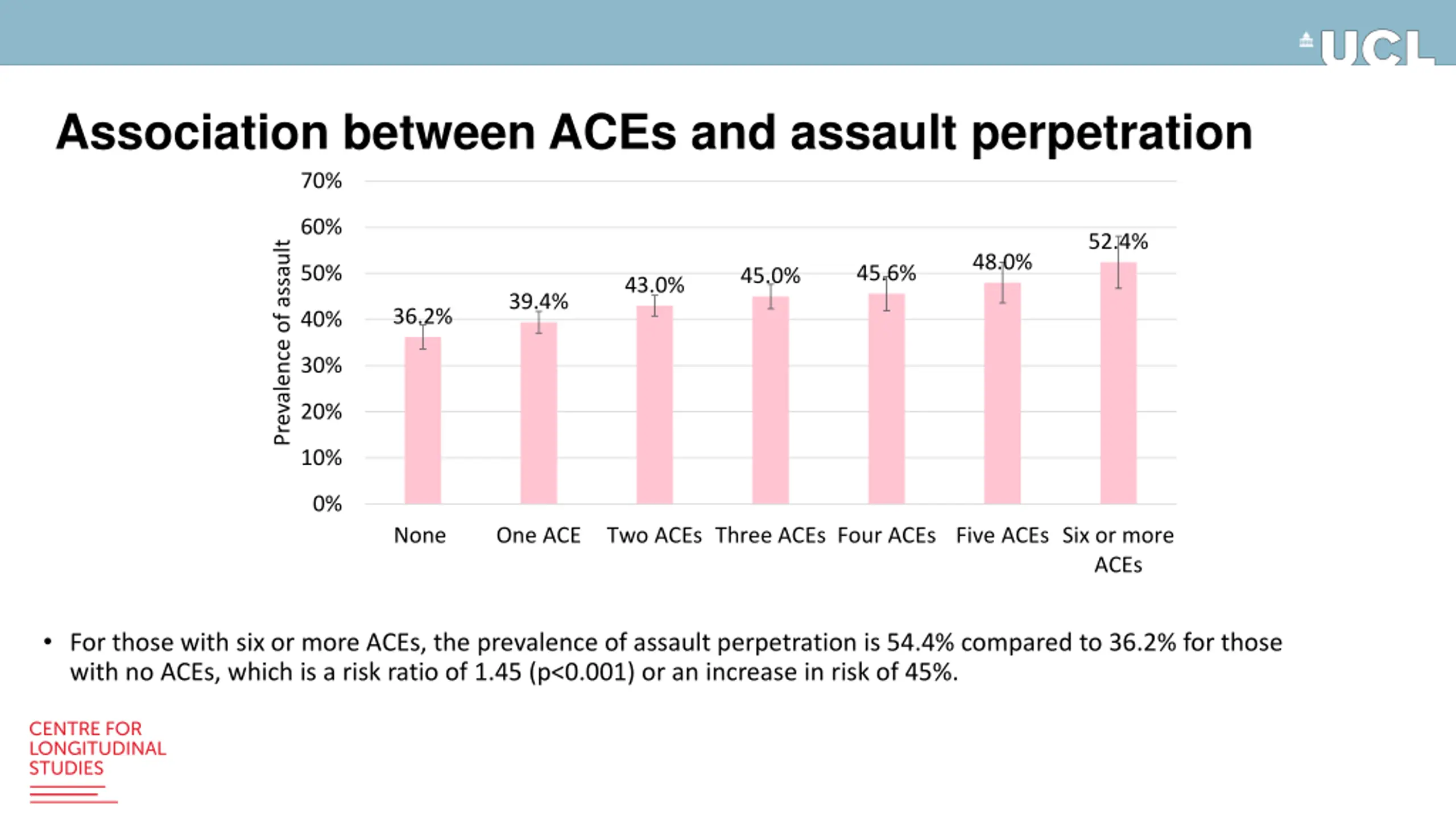 Association between ACEs and assault perpetration 70% 60% 52.4% Prevalence of assault 48.0% 50% 45.6% 45.0% 43.0% 39.4% 36.2% 40% 30% 20% 10% 0% None One ACE Two ACEs Three ACEs Four ACEs Five ACEs Six or more ACEs For those with six or more ACEs, the prevalence of assault perpetration is 54.4% compared to 36.2% for those with no ACEs, which is a risk ratio of 1.45 (p<0.001) or an increase in risk of 45%.