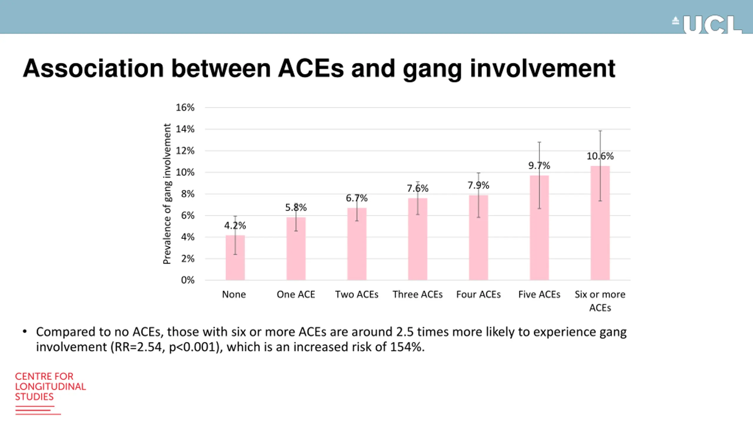 Association between ACEs and gang involvement 16% Prevalence of gang involvement 14% 12% 10.6% 9.7% 10% 7.9% 7.6% 8% 6.7% 5.8% 6% 4.2% 4% 2% 0% None One ACE Two ACEs Three ACEs Four ACEs Five ACEs Six or more ACEs Compared to no ACEs, those with six or more ACEs are around 2.5 times more likely to experience gang involvement (RR=2.54, p<0.001), which is an increased risk of 154%.