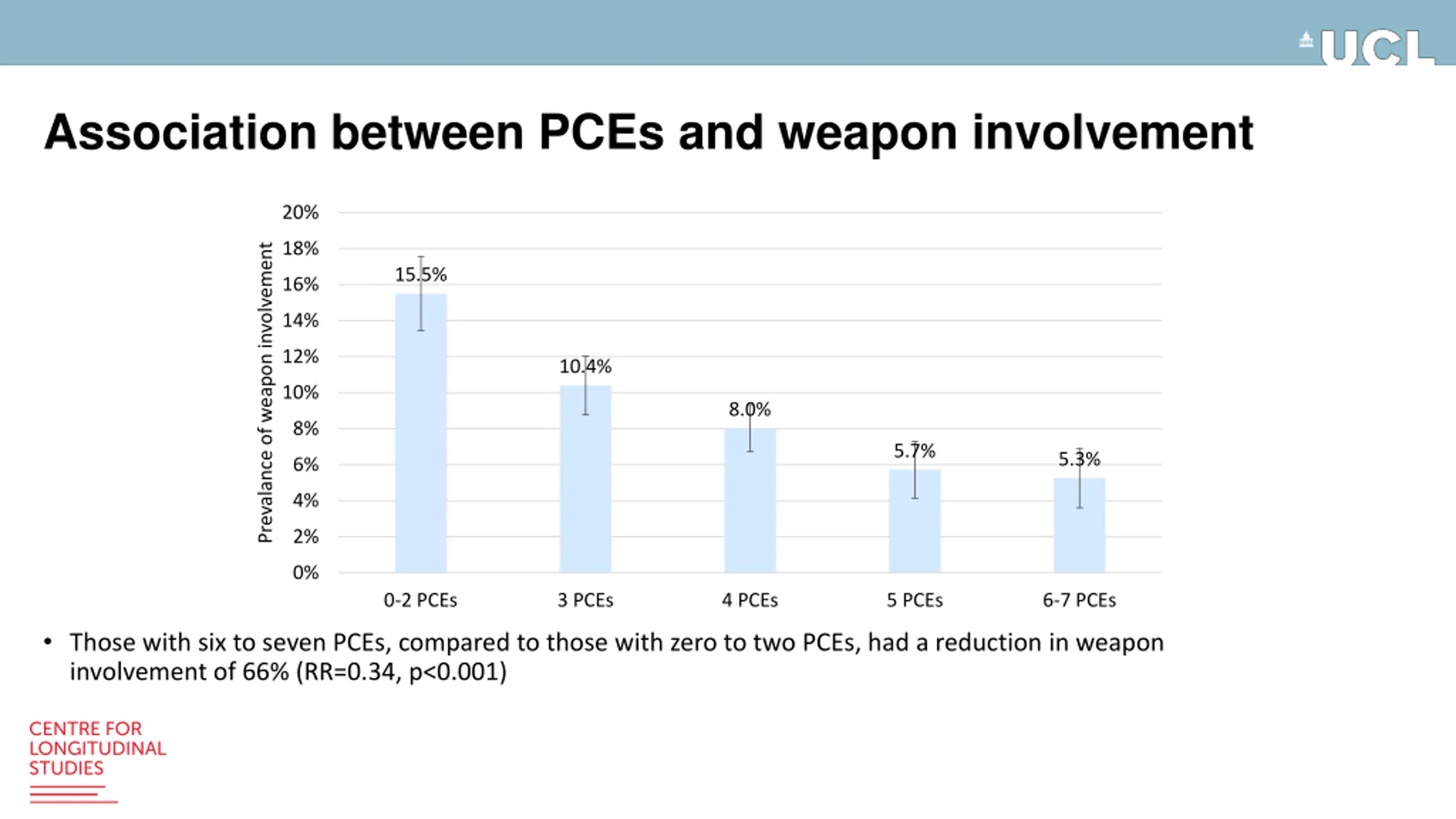 ACEs and PCEs in relation to weapon involvement Low ACEs (0-2) Low PCEs (0-4) 9.4% High PCEs (5+) 4.6% High ACEs (3+) Low PCEs (0-4) 14.0% High PCEs (5+) 7.2% Those with a high number of ACEs and a high number of PCEs, compared to those with high ACEs and low PCEs, had a reduction in risk of weapon involvement of 49% (RR=0.51, p<0.001).