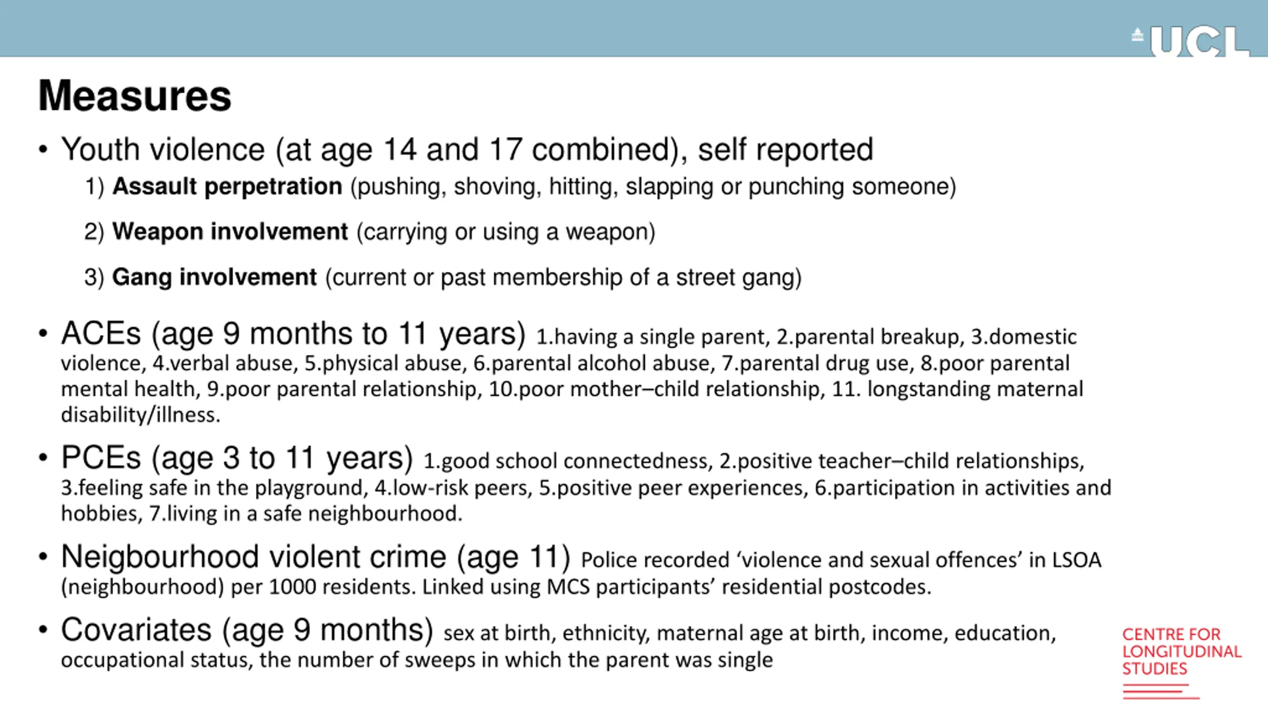 Measures Youth violence (at age 14 and 17 combined), self reported 1) Assault perpetration (pushing, shoving, hitting, slapping or punching someone) 2) Weapon involvement (carrying or using a weapon) 3) Gang involvement (current or past membership of a street gang) ACEs (age 9 months to 11 years) 1.having a single parent, 2.parental breakup, 3.domestic violence, 4.verbal abuse, 5.physical abuse, 6.parental alcohol abuse, 7.parental drug use, 8.poor parental mental health, 9.poor parental relationship, 10.poor mother child relationship, 11. longstanding maternal disability/illness. PCEs (age 3 to 11 years) 1.good school connectedness, 2.positive teacher child relationships, 3.feeling safe in the playground, 4.low-risk peers, 5.positive peer experiences, 6.participation in activities and hobbies, 7.living in a safe neighbourhood. Neigbourhood violent crime (age 11) Police recorded violence and sexual offences in LSOA (neighbourhood) per 1000 residents. Linked using MCS participants residential postcodes. Covariates (age 9 months) sex at birth, ethnicity, maternal age at birth, income, education, occupational status, the number of sweeps in which the parent was single
