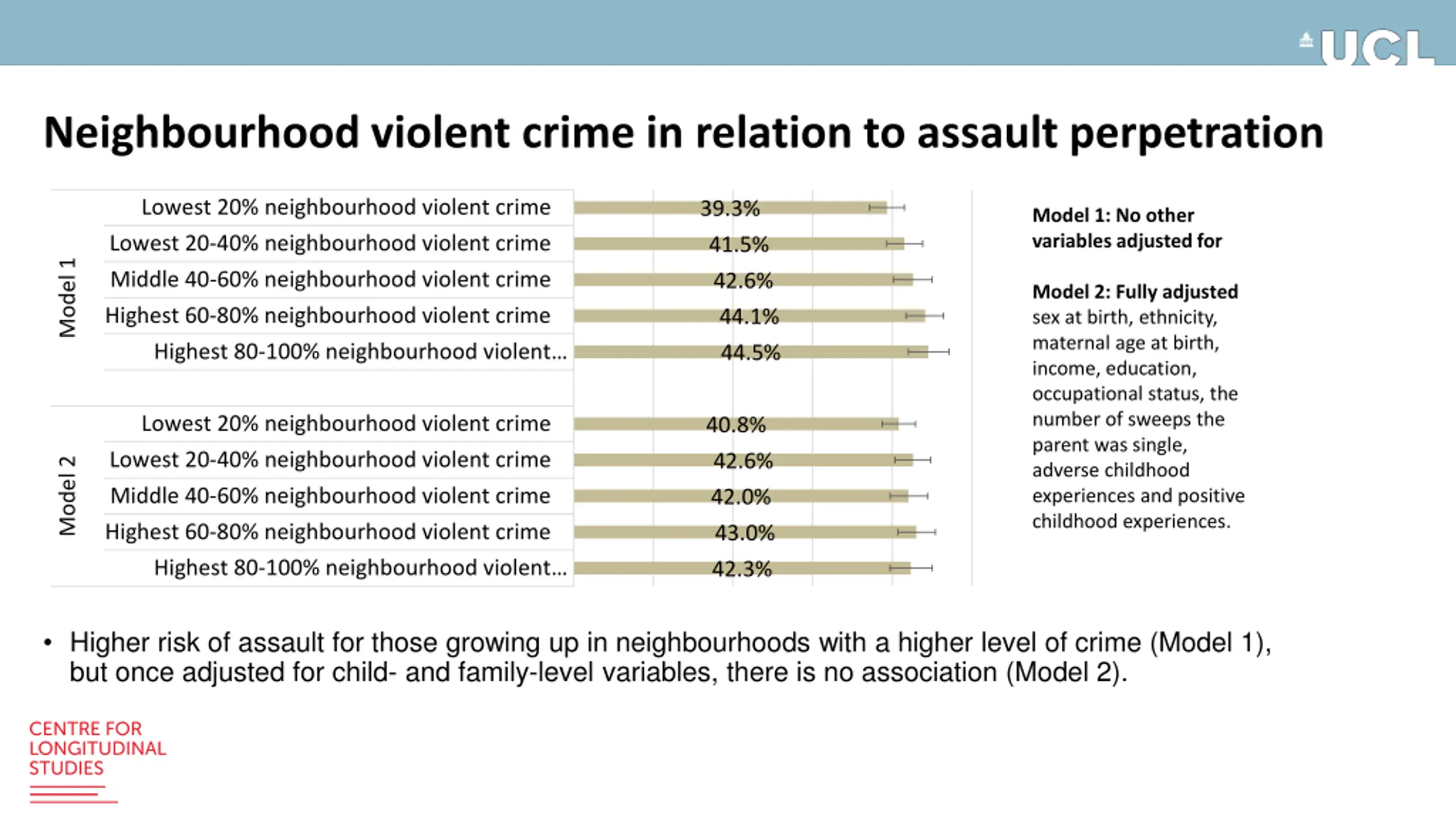 Neighbourhood violent crime in relation to assault perpetration Lowest 20% neighbourhood violent crime Lowest 20-40% neighbourhood violent crime Middle 40-60% neighbourhood violent crime Highest 60-80% neighbourhood violent crime Highest 80-100% neighbourhood violent 39.3% 41.5% 42.6% 44.1% 44.5% Model 1: No other variables adjusted for Model 1 Model 2: Fully adjusted sex at birth, ethnicity, maternal age at birth, income, education, occupational status, the number of sweeps the parent was single, adverse childhood experiences and positive childhood experiences. Lowest 20% neighbourhood violent crime Lowest 20-40% neighbourhood violent crime Middle 40-60% neighbourhood violent crime Highest 60-80% neighbourhood violent crime Highest 80-100% neighbourhood violent 40.8% 42.6% 42.0% 43.0% 42.3% Model 2 Higher risk of assault for those growing up in neighbourhoods with a higher level of crime (Model 1), but once adjusted for child- and family-level variables, there is no association (Model 2).