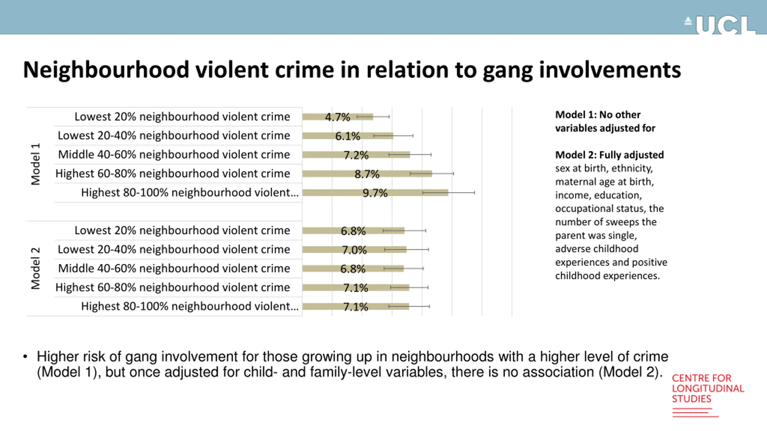 Neighbourhood violent crime in relation to gang involvements Model 1: No other variables adjusted for Lowest 20% neighbourhood violent crime Lowest 20-40% neighbourhood violent crime Middle 40-60% neighbourhood violent crime Highest 60-80% neighbourhood violent crime Highest 80-100% neighbourhood violent 4.7% 6.1% Model 1 7.2% 8.7% Model 2: Fully adjusted sex at birth, ethnicity, maternal age at birth, income, education, occupational status, the number of sweeps the parent was single, adverse childhood experiences and positive childhood experiences. 9.7% Lowest 20% neighbourhood violent crime Lowest 20-40% neighbourhood violent crime Middle 40-60% neighbourhood violent crime Highest 60-80% neighbourhood violent crime Highest 80-100% neighbourhood violent 6.8% 7.0% 6.8% 7.1% 7.1% Model 2 Higher risk of gang involvement for those growing up in neighbourhoods with a higher level of crime (Model 1), but once adjusted for child- and family-level variables, there is no association (Model 2).