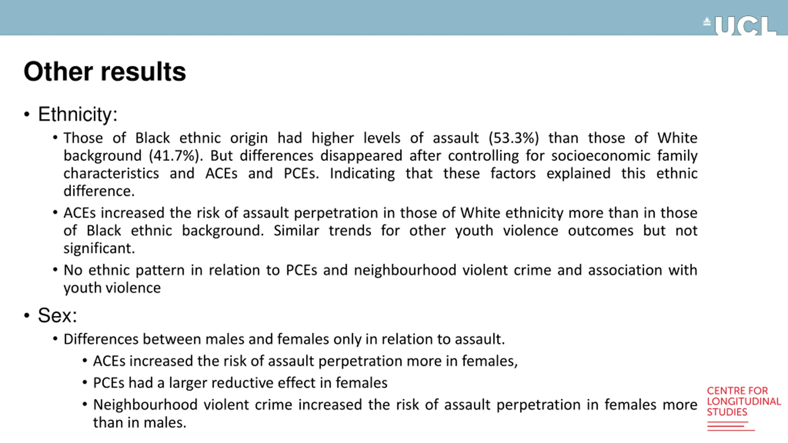 Other results Ethnicity: Those of Black ethnic origin had higher levels of assault (53.3%) than those of White background (41.7%). But differences disappeared after controlling for socioeconomic family characteristics and ACEs and PCEs. Indicating that these factors explained this ethnic difference. ACEs increased the risk of assault perpetration in those of White ethnicity more than in those of Black ethnic background. Similar trends for other youth violence outcomes but not significant. No ethnic pattern in relation to PCEs and neighbourhood violent crime and association with youth violence Sex: Differences between males and females only in relation to assault. ACEs increased the risk of assault perpetration more in females, PCEs had a larger reductive effect in females Neighbourhood violent crime increased the risk of assault perpetration in females more than in males.