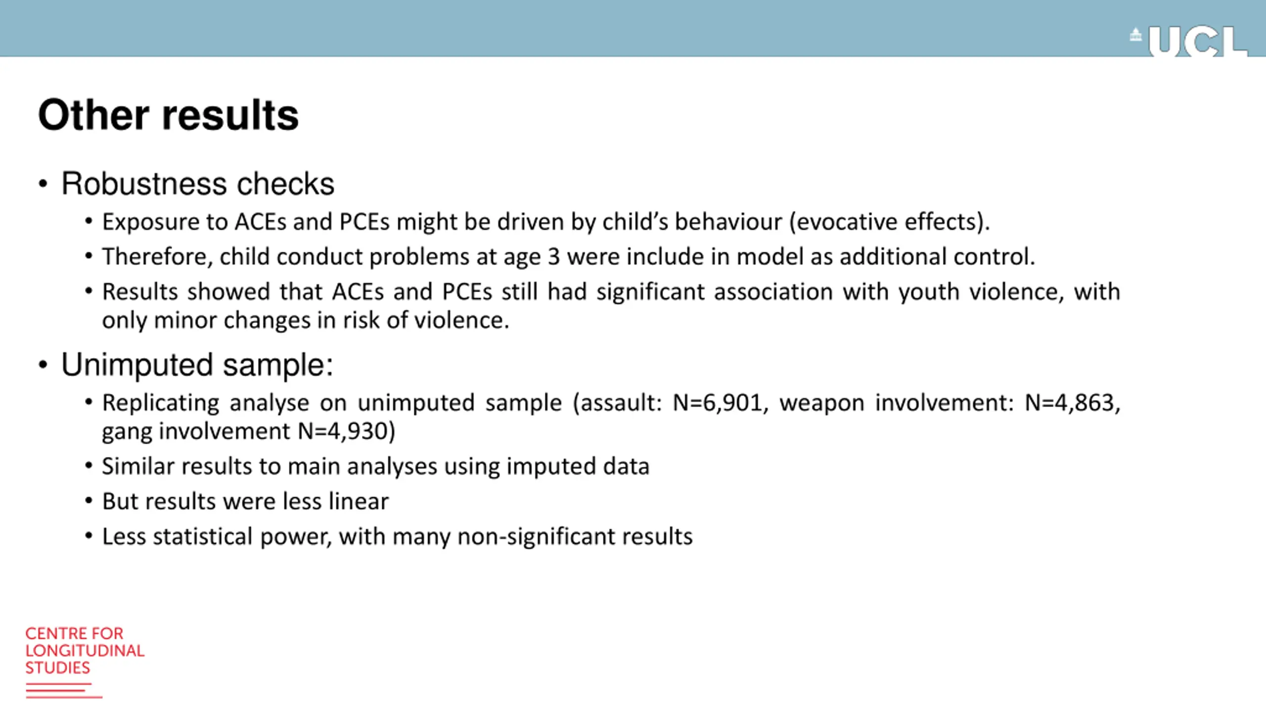 Other results Robustness checks Exposure to ACEs and PCEs might be driven by child s behaviour (evocative effects). Therefore, child conduct problems at age 3 were include in model as additional control. Results showed that ACEs and PCEs still had significant association with youth violence, with only minor changes in risk of violence. Unimputed sample: Replicating analyse on unimputed sample (assault: N=6,901, weapon involvement: N=4,863, gang involvement N=4,930) Similar results to main analyses using imputed data But results were less linear Less statistical power, with many non-significant results