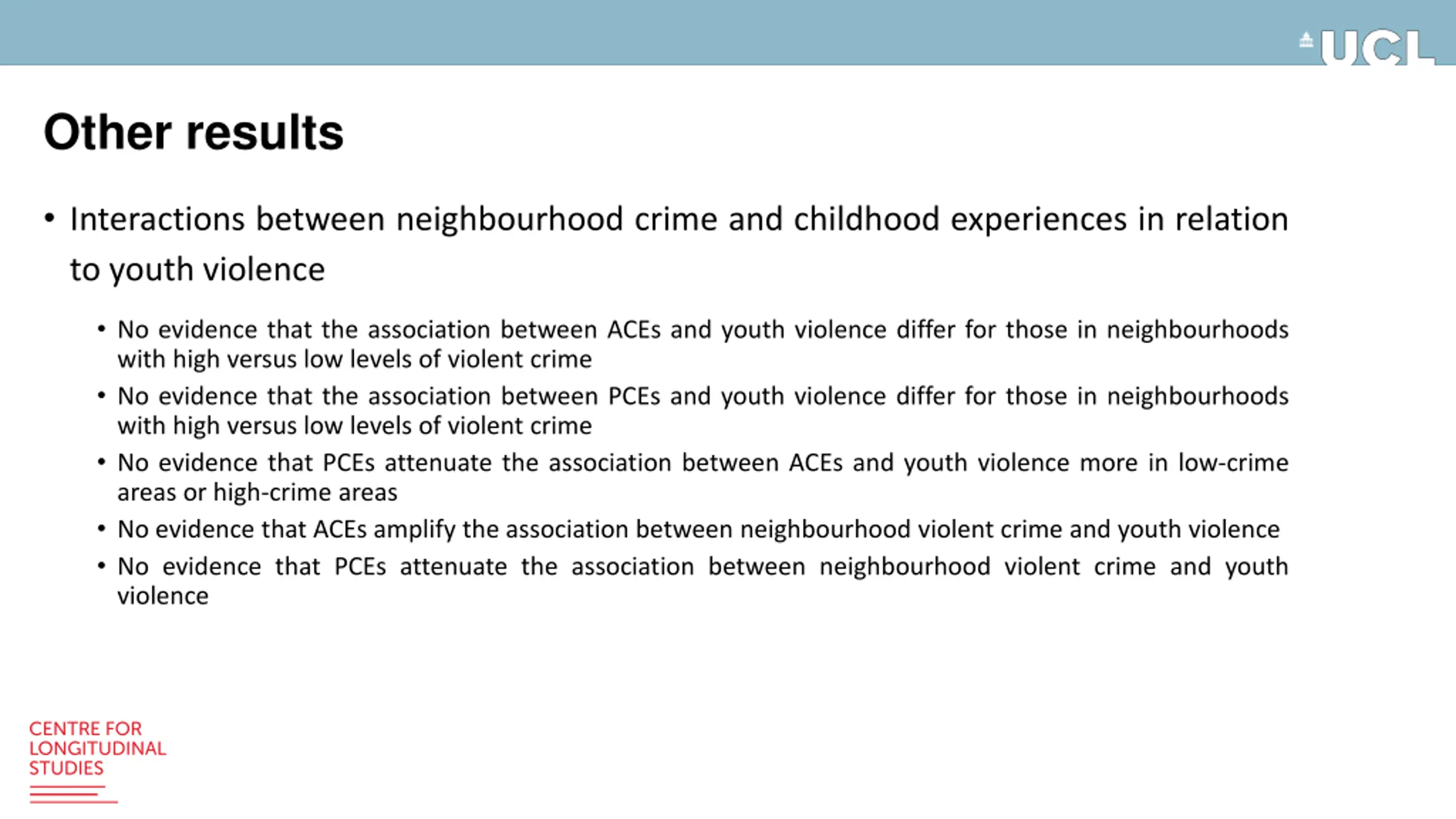 Other results Interactions between neighbourhood crime and childhood experiences in relation to youth violence No evidence that the association between ACEs and youth violence differ for those in neighbourhoods with high versus low levels of violent crime No evidence that the association between PCEs and youth violence differ for those in neighbourhoods with high versus low levels of violent crime No evidence that PCEs attenuate the association between ACEs and youth violence more in low-crime areas or high-crime areas No evidence that ACEs amplify the association between neighbourhood violent crime and youth violence No evidence that PCEs attenuate the association between neighbourhood violent crime and youth violence