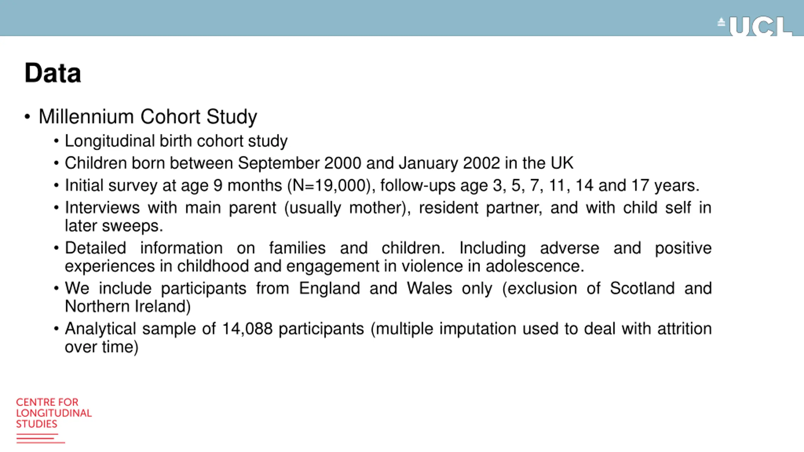 Data Millennium Cohort Study Longitudinal birth cohort study Children born between September 2000 and January 2002 in the UK Initial survey at age 9 months (N=19,000), follow-ups age 3, 5, 7, 11, 14 and 17 years. Interviews with main parent (usually mother), resident partner, and with child self in later sweeps. Detailed information on families and children. Including adverse and positive experiences in childhood and engagement in violence in adolescence. We include participants from England and Wales only (exclusion of Scotland and Northern Ireland) Analytical sample of 14,088 participants (multiple imputation used to deal with attrition over time)