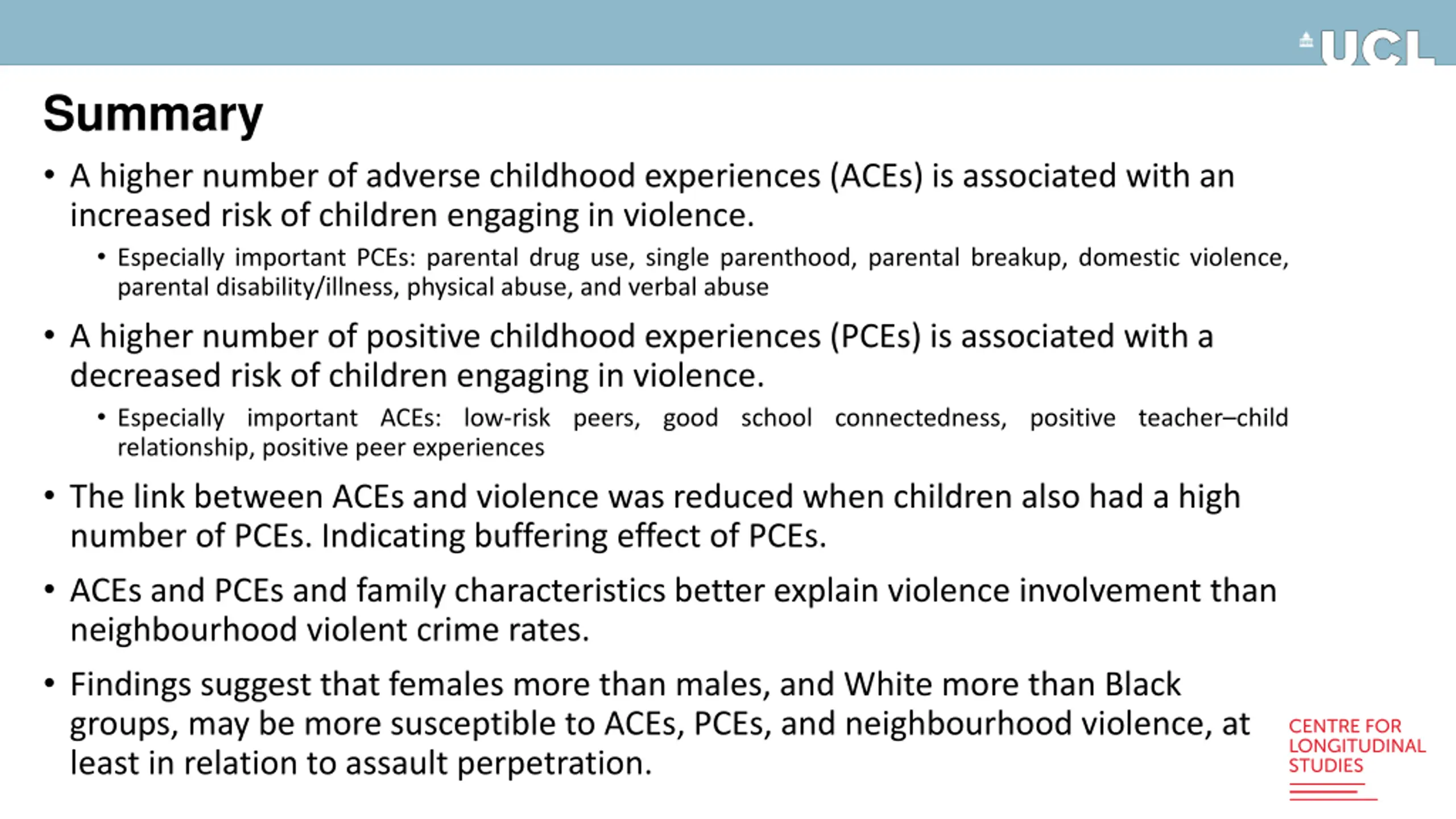 Summary A higher number of adverse childhood experiences (ACEs) is associated with an increased risk of children engaging in violence. Especially important PCEs: parental drug use, single parenthood, parental breakup, domestic violence, parental disability/illness, physical abuse, and verbal abuse A higher number of positive childhood experiences (PCEs) is associated with a decreased risk of children engaging in violence. Especially important ACEs: low-risk peers, good school connectedness, positive teacher child relationship, positive peer experiences The link between ACEs and violence was reduced when children also had a high number of PCEs. Indicating buffering effect of PCEs. ACEs and PCEs and family characteristics better explain violence involvement than neighbourhood violent crime rates. Findings suggest that females more than males, and White more than Black groups, may be more susceptible to ACEs, PCEs, and neighbourhood violence, at least in relation to assault perpetration.