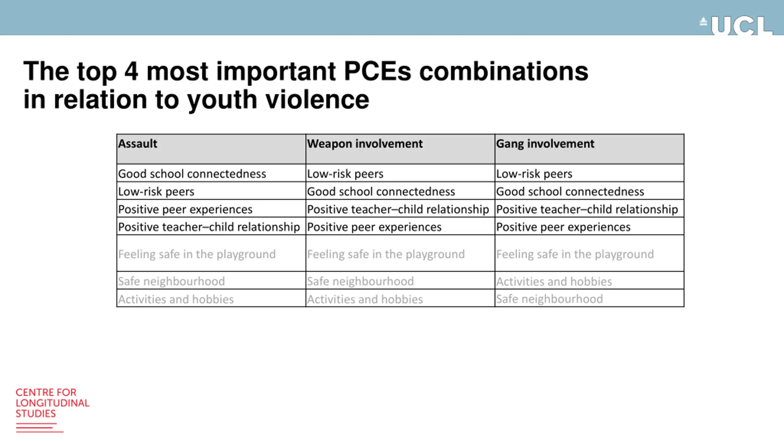 Implications for youth violence reduction Violence prevention efforts should work with children who ve experience multiple ACEs, especially parental drug use, domestic violence, physical and verbal abuse, single parent families, and parents with a long-term illness or disability. Prevention work to avoid ACEs within families in the first place Promotion of PCEs, especially for vulnerable children, with focus on healthy and positive relationships with the school and teachers and with peers. Schools based interventions may have an important role here. Addressing upstream structural and socioeconomic inequalities which are strongly associated with ACEs and PCEs Youth violence highly related to other types of youth offending, so prevention may have wider impacts on crime. Benefits of reducing youth violence also likely to enhance other future outcomes for individuals Societal benefits, including lower public costs in terms of criminal justice, healthcare, social services and benefit payments. Investments in youth violence reduction likely to save costs in the long term.