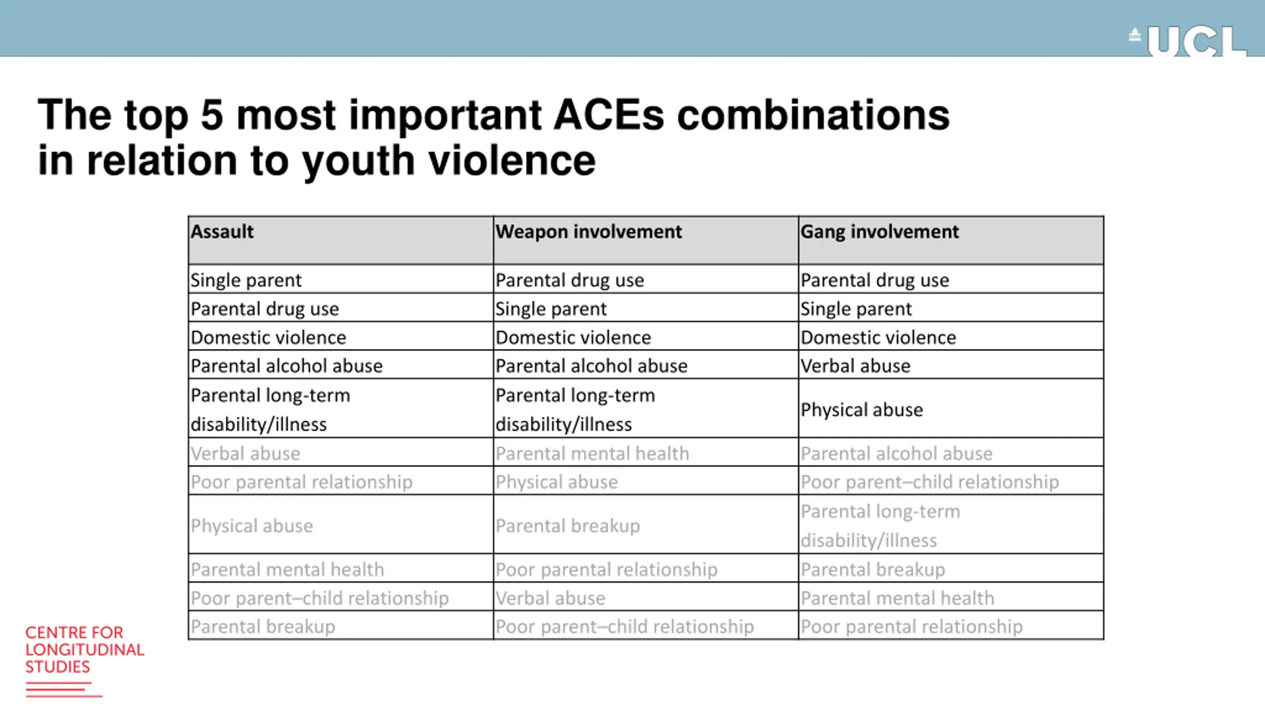 The top 5 most important ACEs combinations in relation to youth violence Assault Weapon involvement Gang involvement Single parent Parental drug use Domestic violence Parental alcohol abuse Parental long-term disability/illness Verbal abuse Poor parental relationship Parental drug use Single parent Domestic violence Parental alcohol abuse Parental long-term disability/illness Parental mental health Physical abuse Parental drug use Single parent Domestic violence Verbal abuse Physical abuse Parental alcohol abuse Poor parent child relationship Parental long-term disability/illness Parental breakup Parental mental health Poor parental relationship Physical abuse Parental breakup Parental mental health Poor parent child relationship Parental breakup Poor parental relationship Verbal abuse Poor parent child relationship