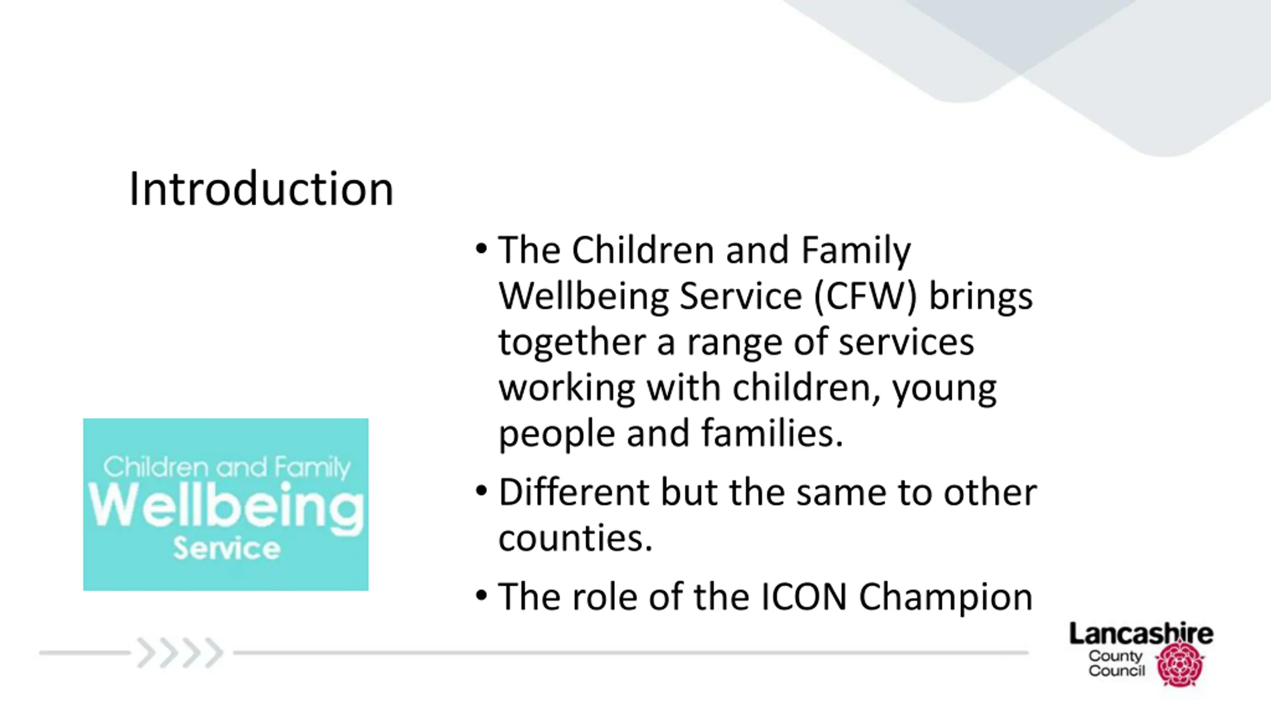 Introduction The Children and Family Wellbeing Service (CFW) brings together a range of services working with children, young people and families. Different but the same to other counties. The role of the ICON Champion