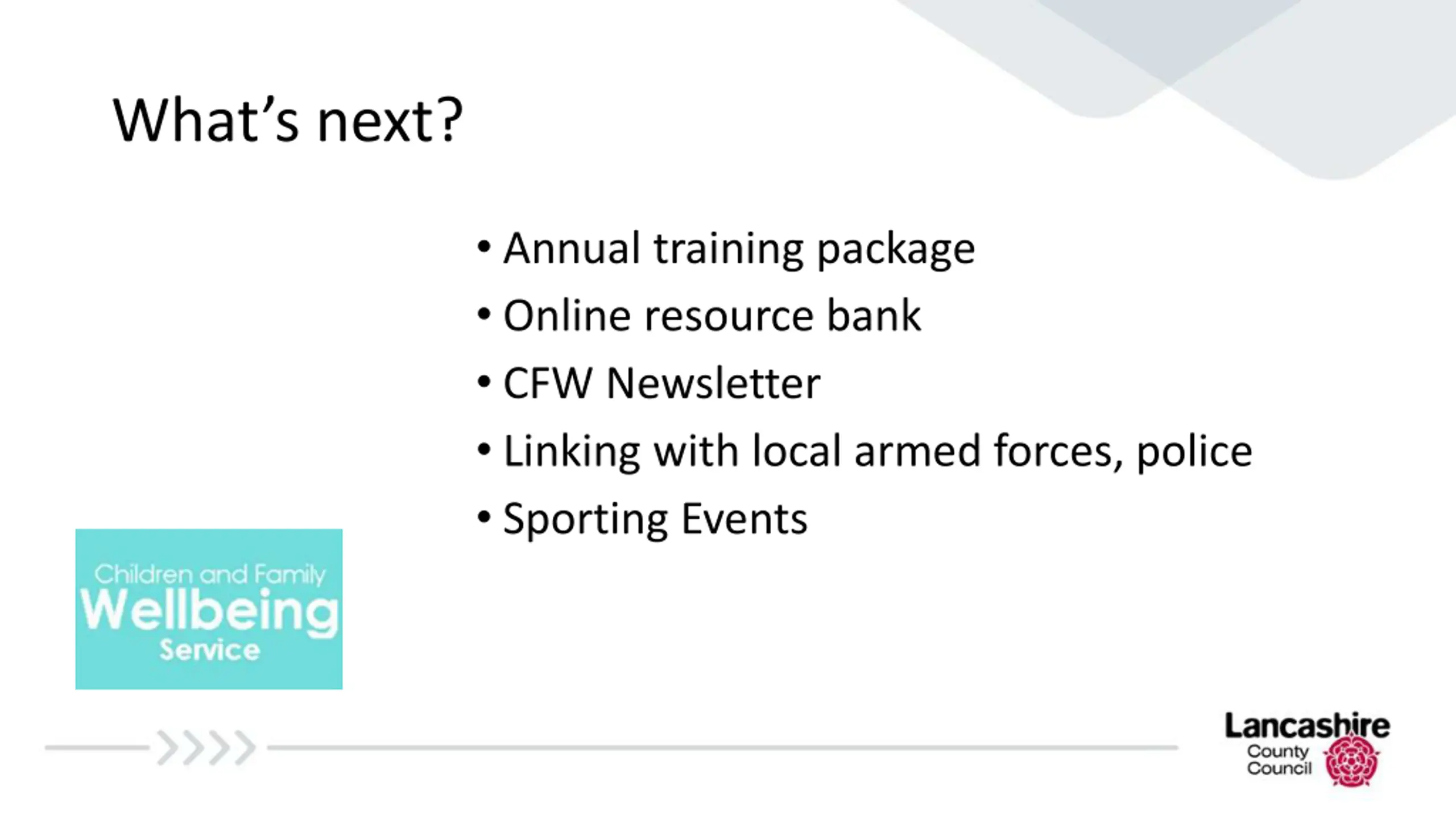 Whats next? Annual training package Online resource bank CFW Newsletter Linking with local armed forces, police Sporting Events