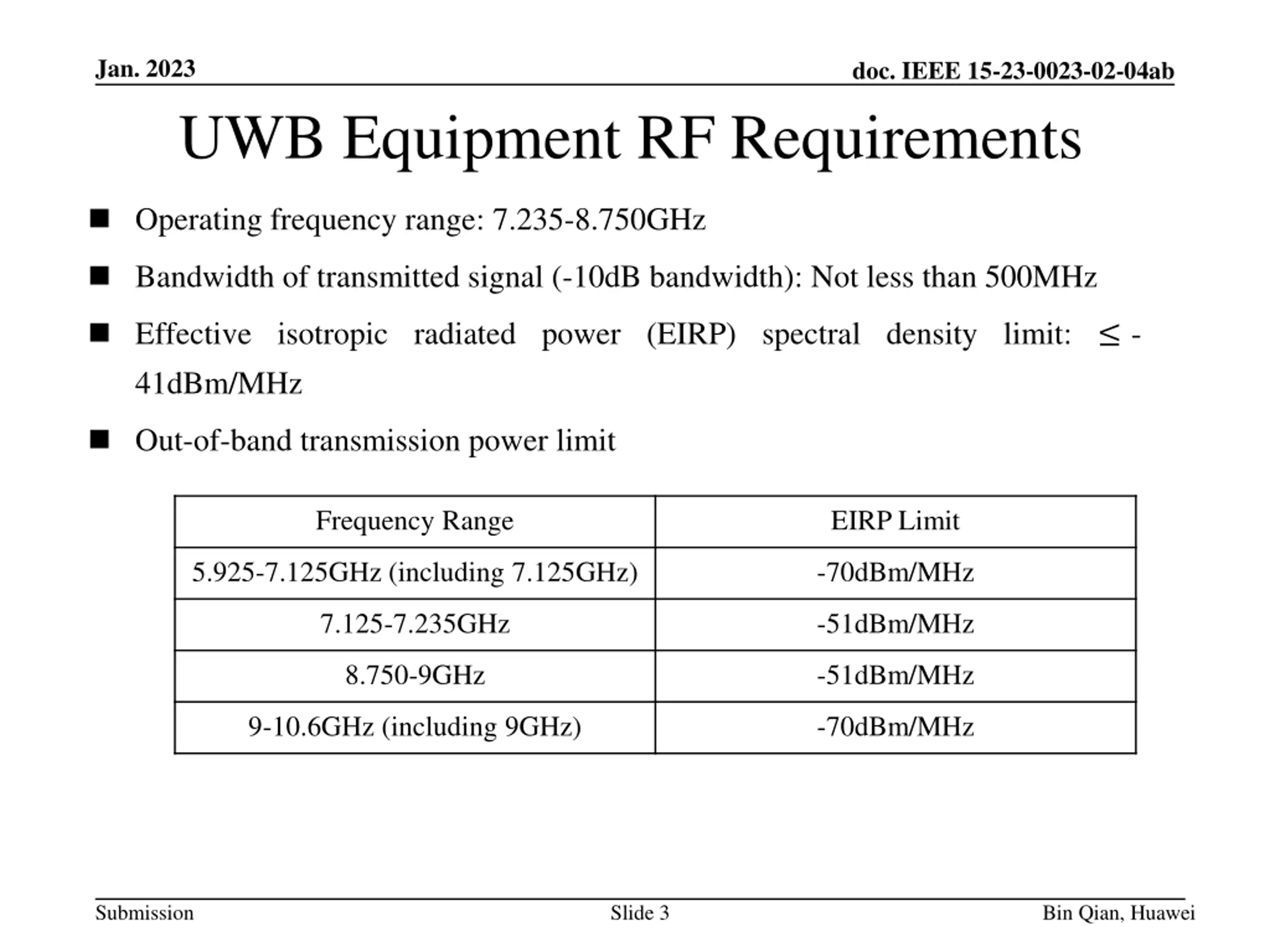 Jan. 2023 doc. IEEE 15-23-0023-02-04ab UWB Equipment RF Requirements Operating frequency range: 7.235-8.750GHz Bandwidth of transmitted signal (-10dB bandwidth): Not less than 500MHz Effective isotropic radiated power (EIRP) spectral density limit: - 41dBm/MHz Out-of-band transmission power limit Frequency Range EIRP Limit 5.925-7.125GHz (including 7.125GHz) -70dBm/MHz 7.125-7.235GHz -51dBm/MHz 8.750-9GHz -51dBm/MHz 9-10.6GHz (including 9GHz) -70dBm/MHz Submission Slide 3 Bin Qian, Huawei