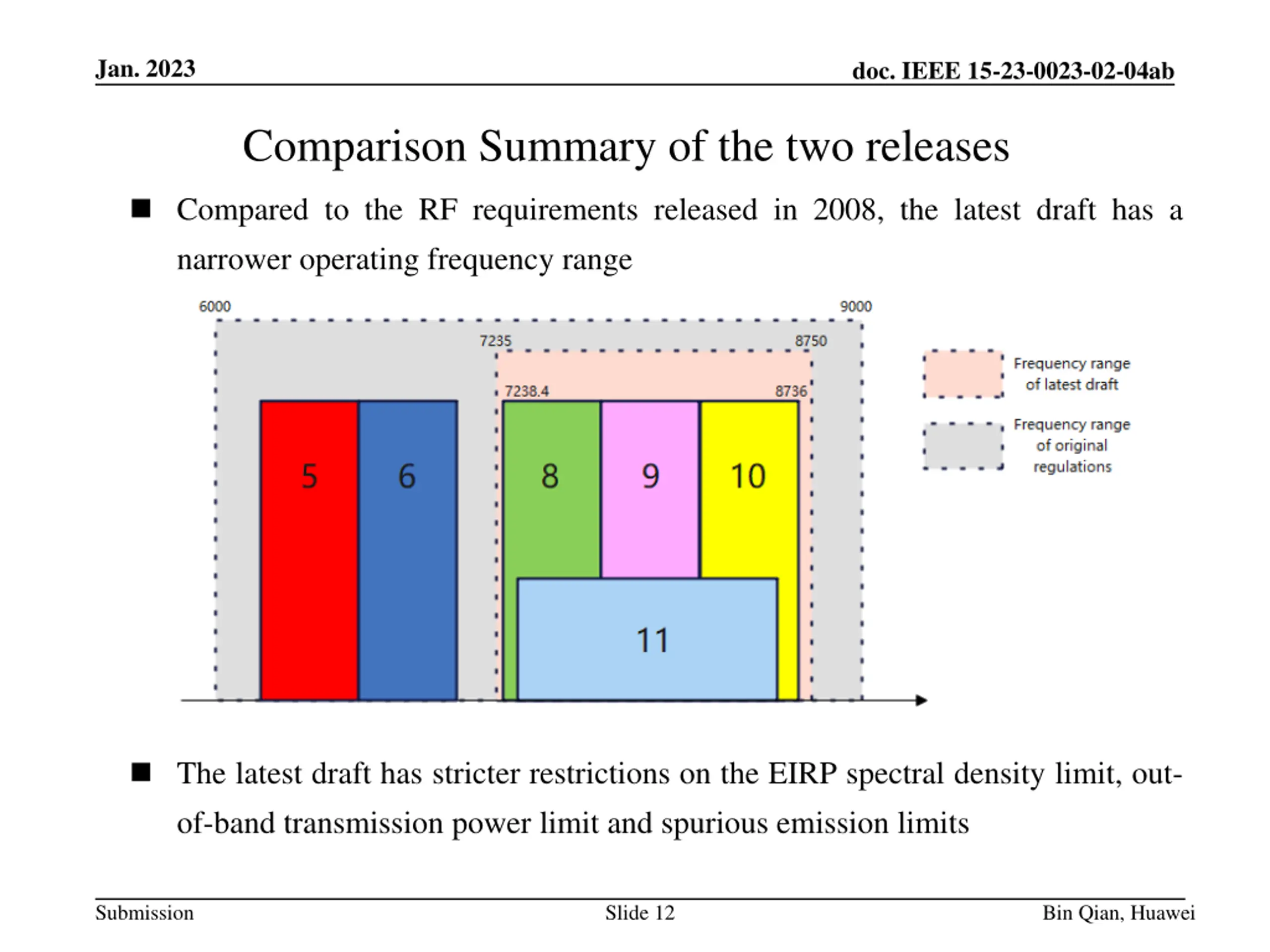 Jan. 2023 doc. IEEE 15-23-0023-02-04ab Comparison of the two releases Item Release 2008 Release 2023 -10dB bandwidth Not less than 500MHz Operating frequency range 6G-9GHz 7.235-8.750GHz Frequency Band (GHz) Limit (dBm/MHz) Frequency Band (GHz) Limit (dBm/MHz) Below 1.6 -90 1.6-3.6 -85 EIRP spectral density limit 3.6-6.0 -70 7.235-8.750 -41 6.0-9.0 -41 9.0-10.6 -70 Above 10.6 -85 Frequency Band (GHz) Limit (dBm/MHz) 5.925-7.125 (including 7.125) -70 Out-of-band transmission power limit / 7.125-7.235 -51 8.750-9 -51 9-10.6 (including 9) -70 Submission Slide 10 Bin Qian, Huawei