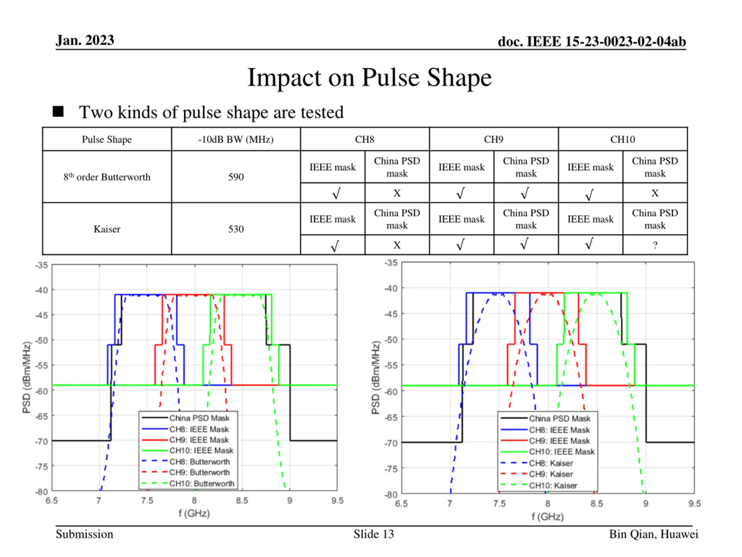 Jan. 2023 doc. IEEE 15-23-0023-02-04ab Impact on Pulse Shape Two kinds of pulse shape are tested Pulse Shape -10dB BW (MHz) CH8 CH9 CH10 China PSD mask China PSD mask China PSD mask IEEE mask IEEE mask IEEE mask 8th order Butterworth 590 X X China PSD mask China PSD mask China PSD mask IEEE mask IEEE mask IEEE mask Kaiser 530 X ? Submission Slide 13 Bin Qian, Huawei