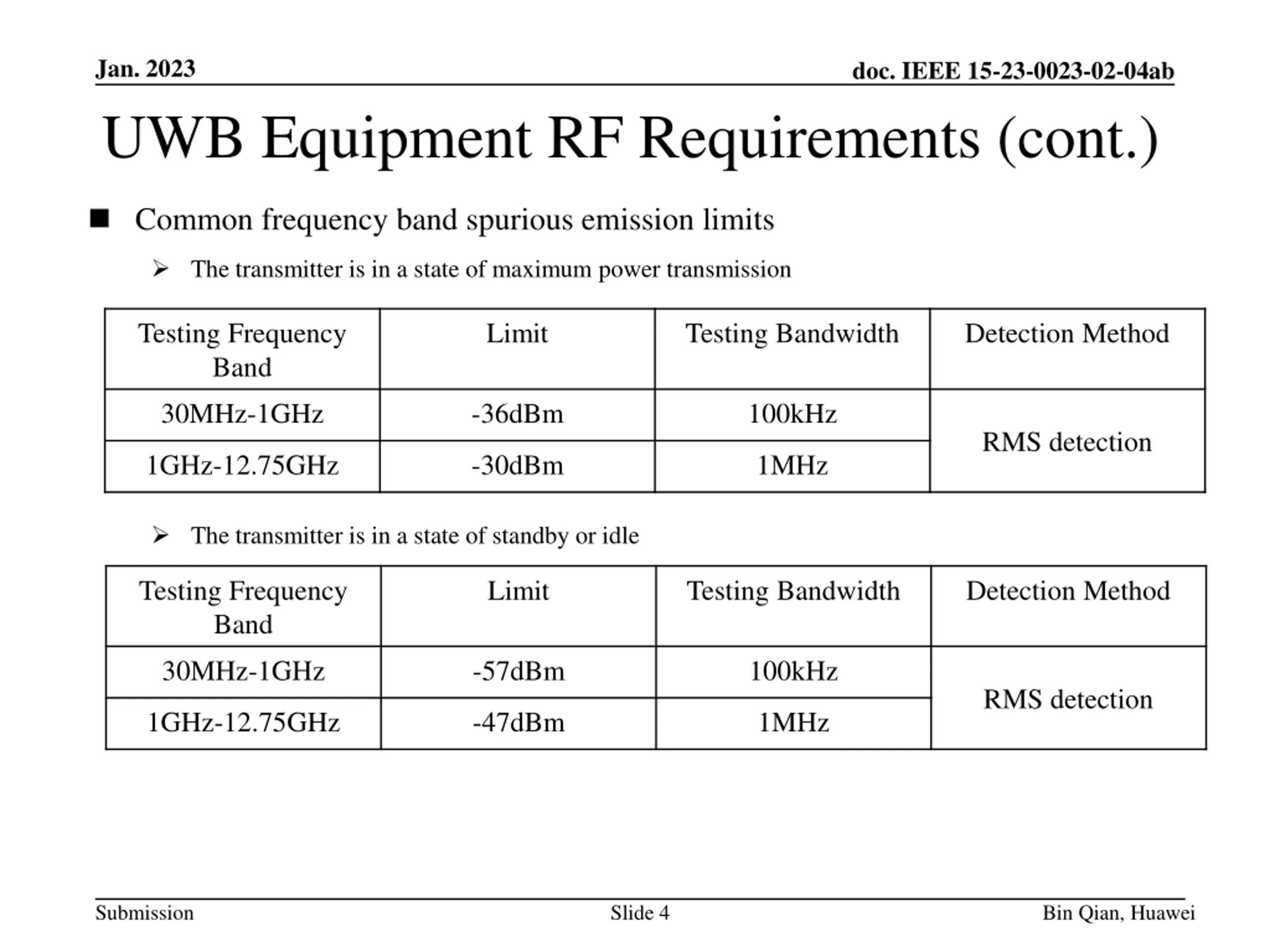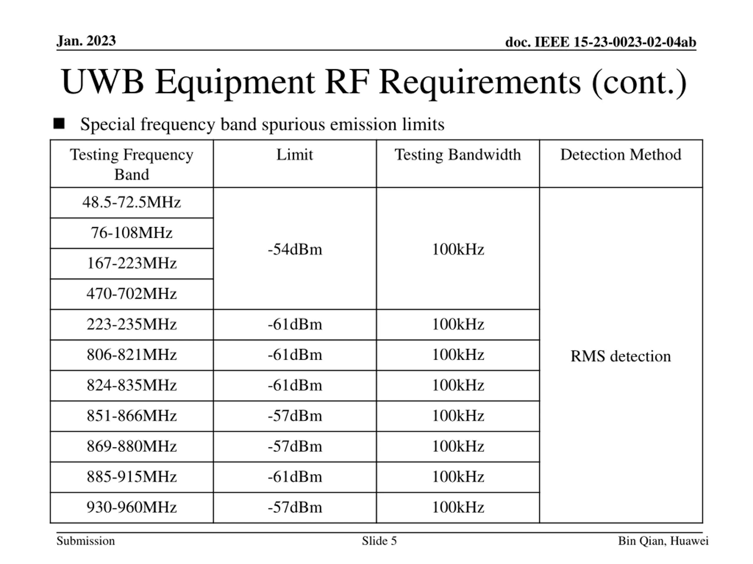 Jan. 2023 doc. IEEE 15-23-0023-02-04ab UWB Equipment RF Requirements (cont.) Common frequency band spurious emission limits The transmitter is in a state of maximum power transmission Testing Frequency Band Limit Testing Bandwidth Detection Method 30MHz-1GHz -36dBm 100kHz RMS detection 1GHz-12.75GHz -30dBm 1MHz The transmitter is in a state of standby or idle Testing Frequency Band Limit Testing Bandwidth Detection Method 30MHz-1GHz -57dBm 100kHz RMS detection 1GHz-12.75GHz -47dBm 1MHz Submission Slide 4 Bin Qian, Huawei