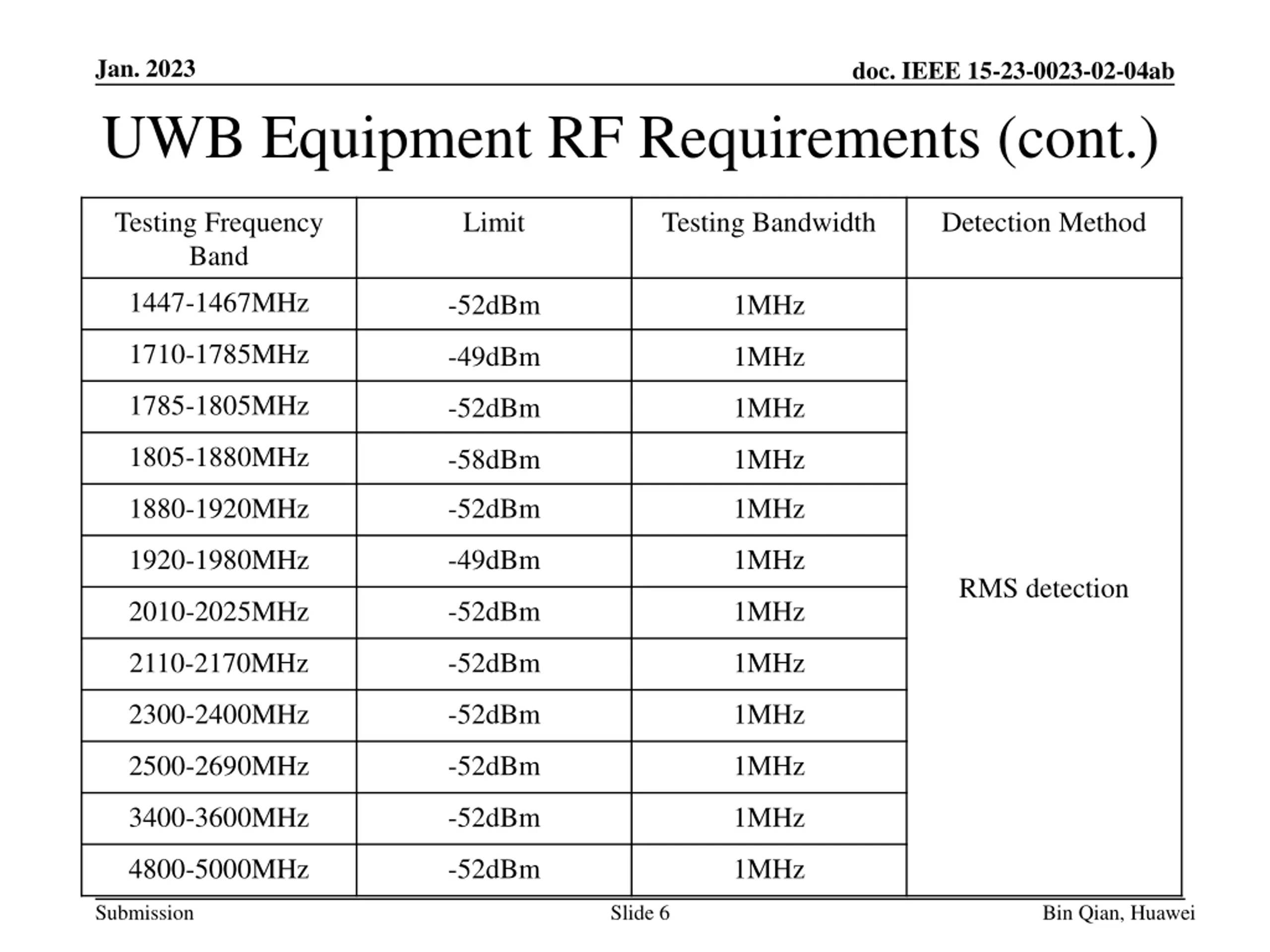 Jan. 2023 doc. IEEE 15-23-0023-02-04ab UWB Equipment RF Requirements (cont.) Special frequency band spurious emission limits Testing Frequency Band Limit Testing Bandwidth Detection Method 48.5-72.5MHz 76-108MHz -54dBm 100kHz 167-223MHz 470-702MHz 223-235MHz -61dBm 100kHz 806-821MHz -61dBm 100kHz RMS detection 824-835MHz -61dBm 100kHz 851-866MHz -57dBm 100kHz 869-880MHz -57dBm 100kHz 885-915MHz -61dBm 100kHz 930-960MHz -57dBm 100kHz Submission Slide 5 Bin Qian, Huawei