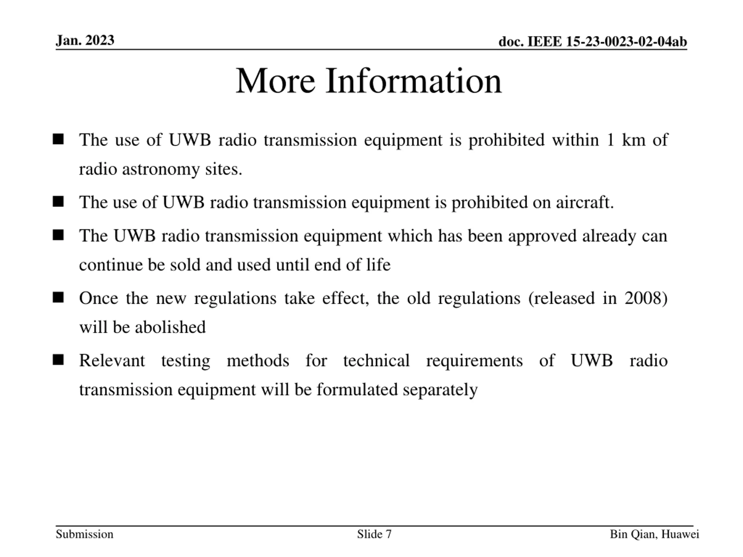 Jan. 2023 doc. IEEE 15-23-0023-02-04ab More Information The use of UWB radio transmission equipment is prohibited within 1 km of radio astronomy sites. The use of UWB radio transmission equipment is prohibited on aircraft. The UWB radio transmission equipment which has been approved already can continue be sold and used until end of life Once the new regulations take effect, the old regulations (released in 2008) will be abolished Relevant testing methods for technical requirements of UWB radio transmission equipment will be formulated separately Submission Slide 7 Bin Qian, Huawei