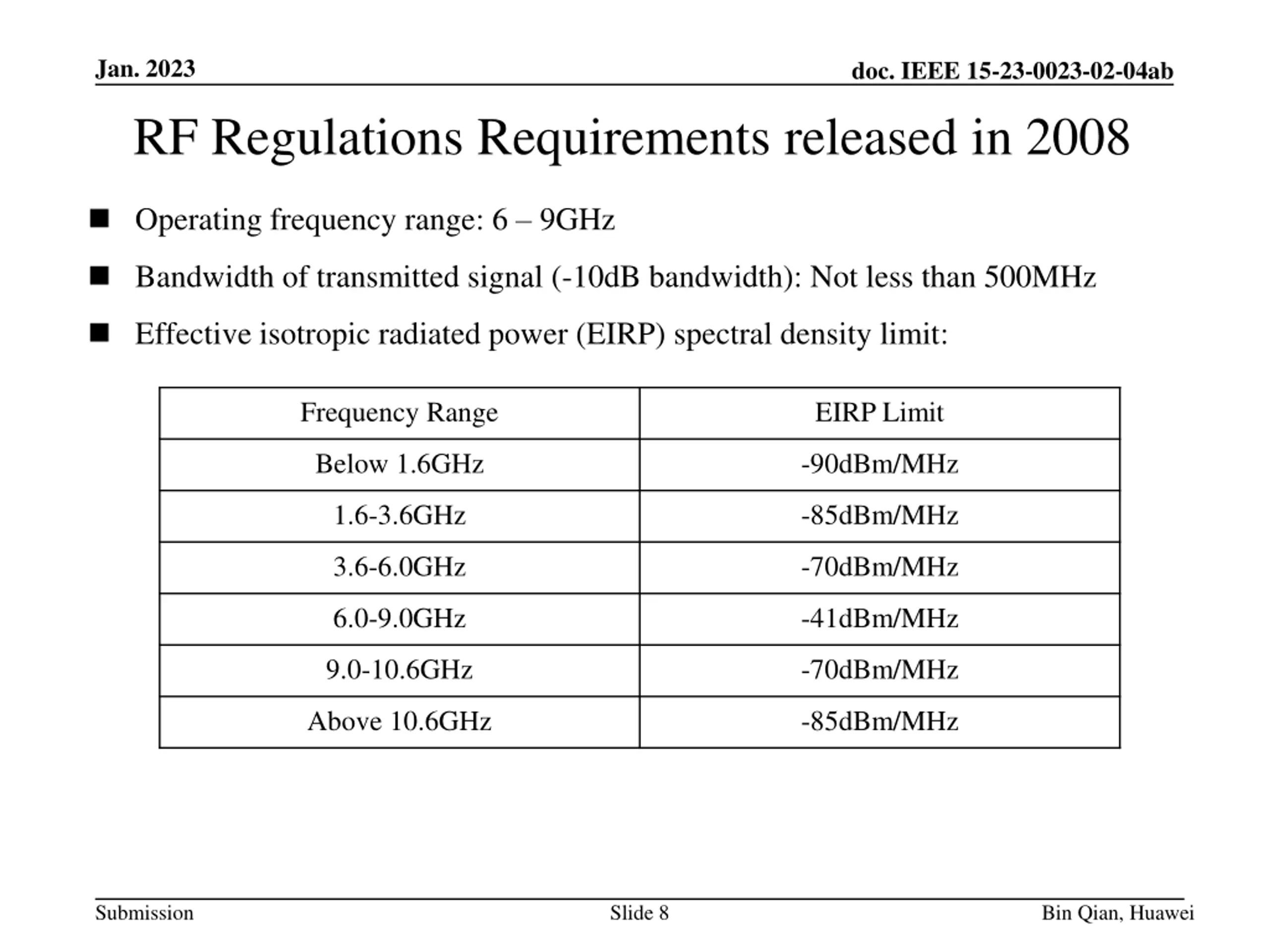Jan. 2023 doc. IEEE 15-23-0023-02-04ab RF Regulations Requirements released in 2008 Operating frequency range: 6 9GHz Bandwidth of transmitted signal (-10dB bandwidth): Not less than 500MHz Effective isotropic radiated power (EIRP) spectral density limit: Frequency Range EIRP Limit Below 1.6GHz -90dBm/MHz 1.6-3.6GHz -85dBm/MHz 3.6-6.0GHz -70dBm/MHz 6.0-9.0GHz -41dBm/MHz 9.0-10.6GHz -70dBm/MHz Above 10.6GHz -85dBm/MHz Submission Slide 8 Bin Qian, Huawei