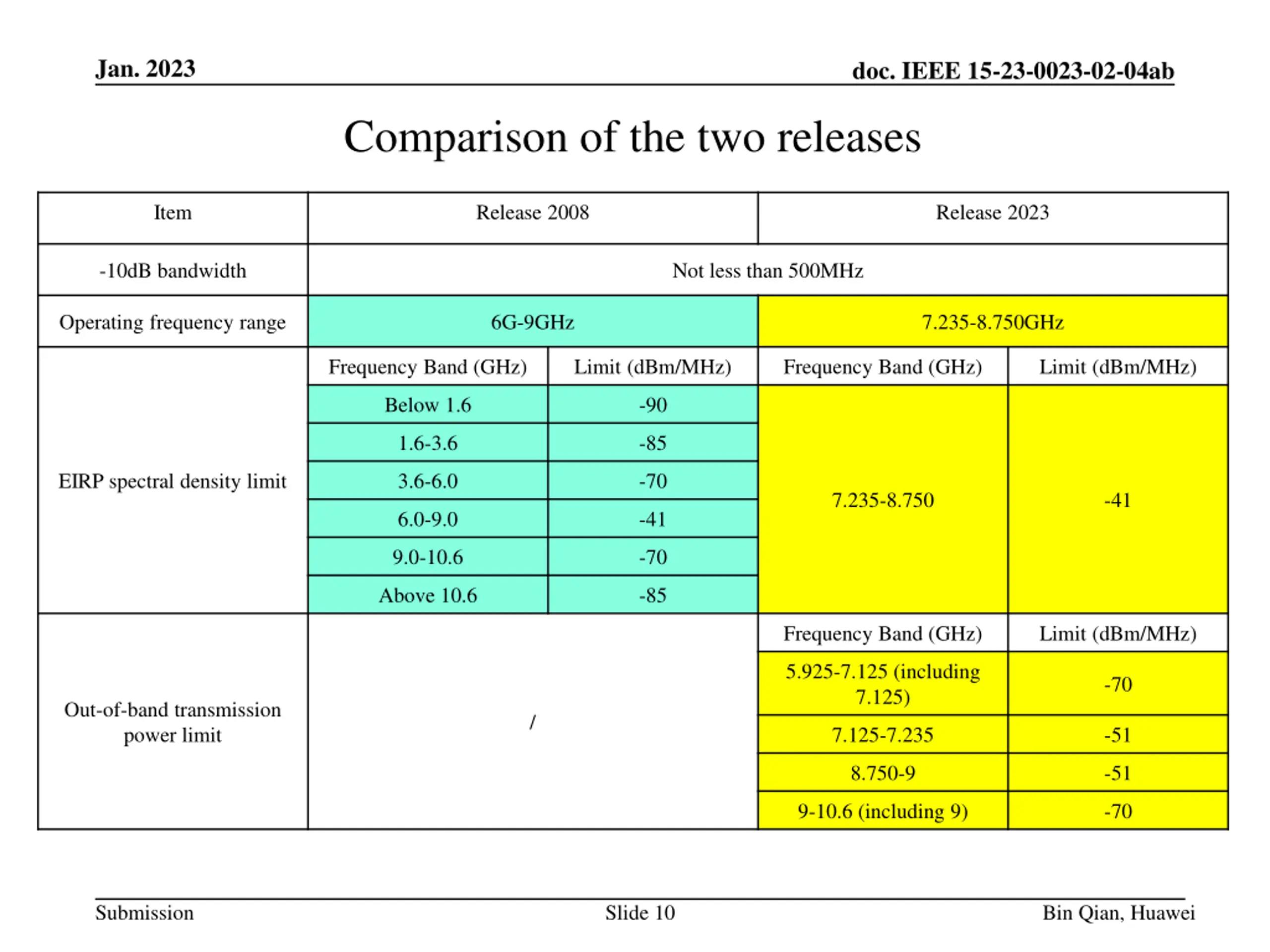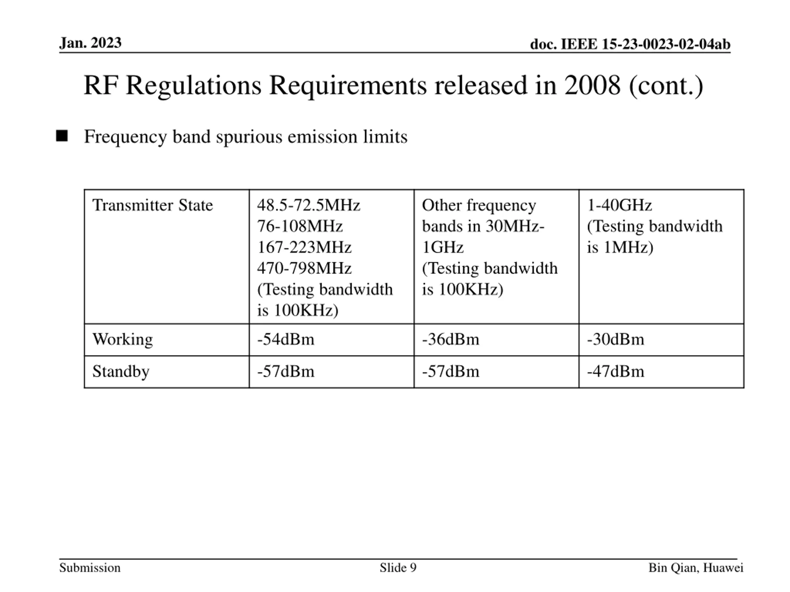 Jan. 2023 doc. IEEE 15-23-0023-02-04ab RF Regulations Requirements released in 2008 (cont.) Frequency band spurious emission limits Transmitter State 48.5-72.5MHz 76-108MHz 167-223MHz 470-798MHz (Testing bandwidth is 100KHz) Other frequency bands in 30MHz- 1GHz (Testing bandwidth is 100KHz) 1-40GHz (Testing bandwidth is 1MHz) Working -54dBm -36dBm -30dBm Standby -57dBm -57dBm -47dBm Submission Slide 9 Bin Qian, Huawei