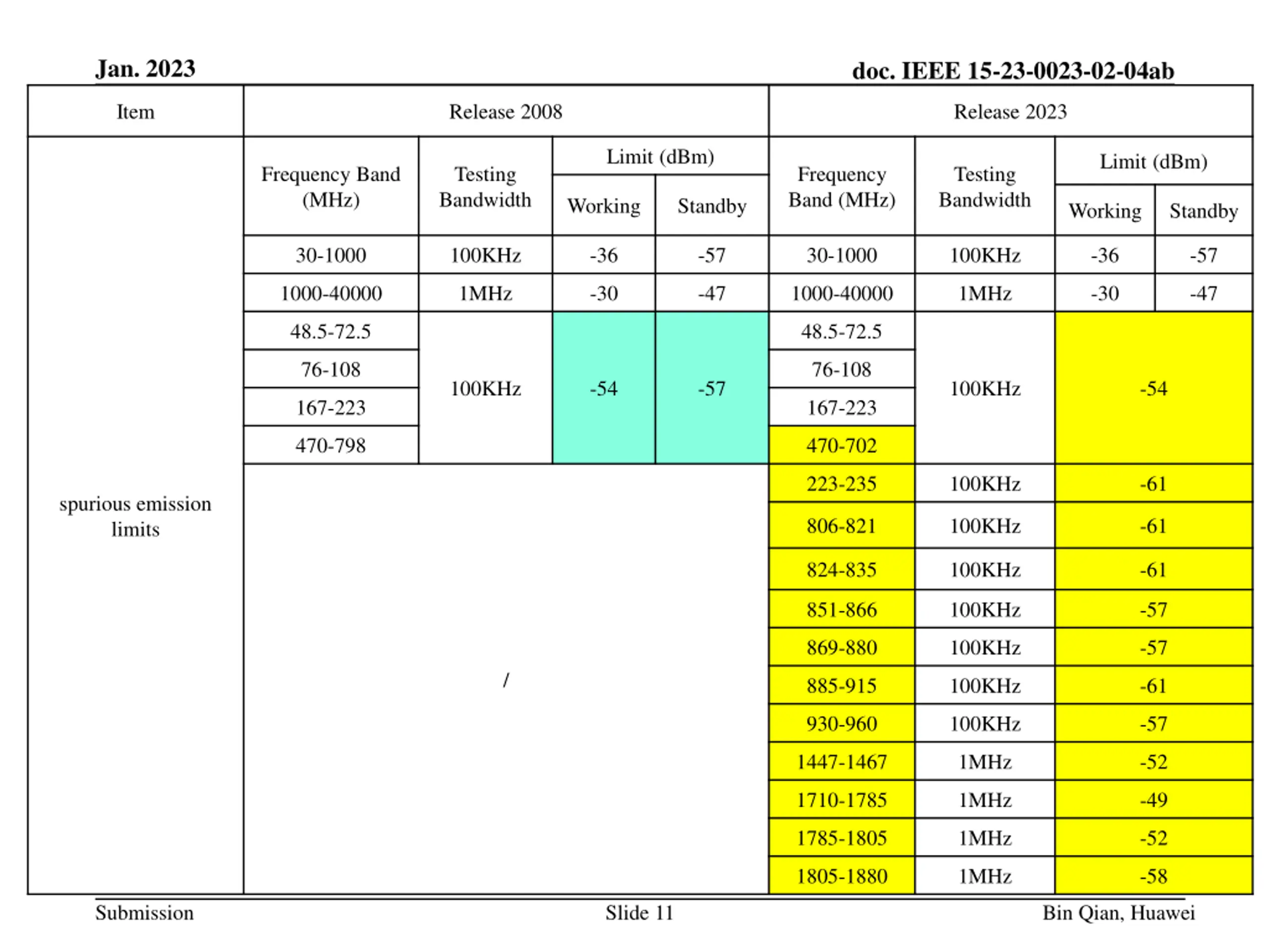 Jan. 2023 doc. IEEE 15-23-0023-02-04ab Item Release 2008 Release 2023 Limit (dBm) Limit (dBm) Frequency Band (MHz) Testing Bandwidth Frequency Band (MHz) Testing Bandwidth Working Standby Working Standby 30-1000 100KHz -36 -57 30-1000 100KHz -36 -57 1000-40000 1MHz -30 -47 1000-40000 1MHz -30 -47 48.5-72.5 48.5-72.5 76-108 76-108 100KHz -54 -57 100KHz -54 167-223 167-223 470-798 470-702 223-235 100KHz -61 spurious emission limits 806-821 100KHz -61 824-835 100KHz -61 851-866 100KHz -57 869-880 100KHz -57 / 885-915 100KHz -61 930-960 100KHz -57 1447-1467 1MHz -52 1710-1785 1MHz -49 1785-1805 1MHz -52 1805-1880 1MHz -58 Submission Slide 11 Bin Qian, Huawei