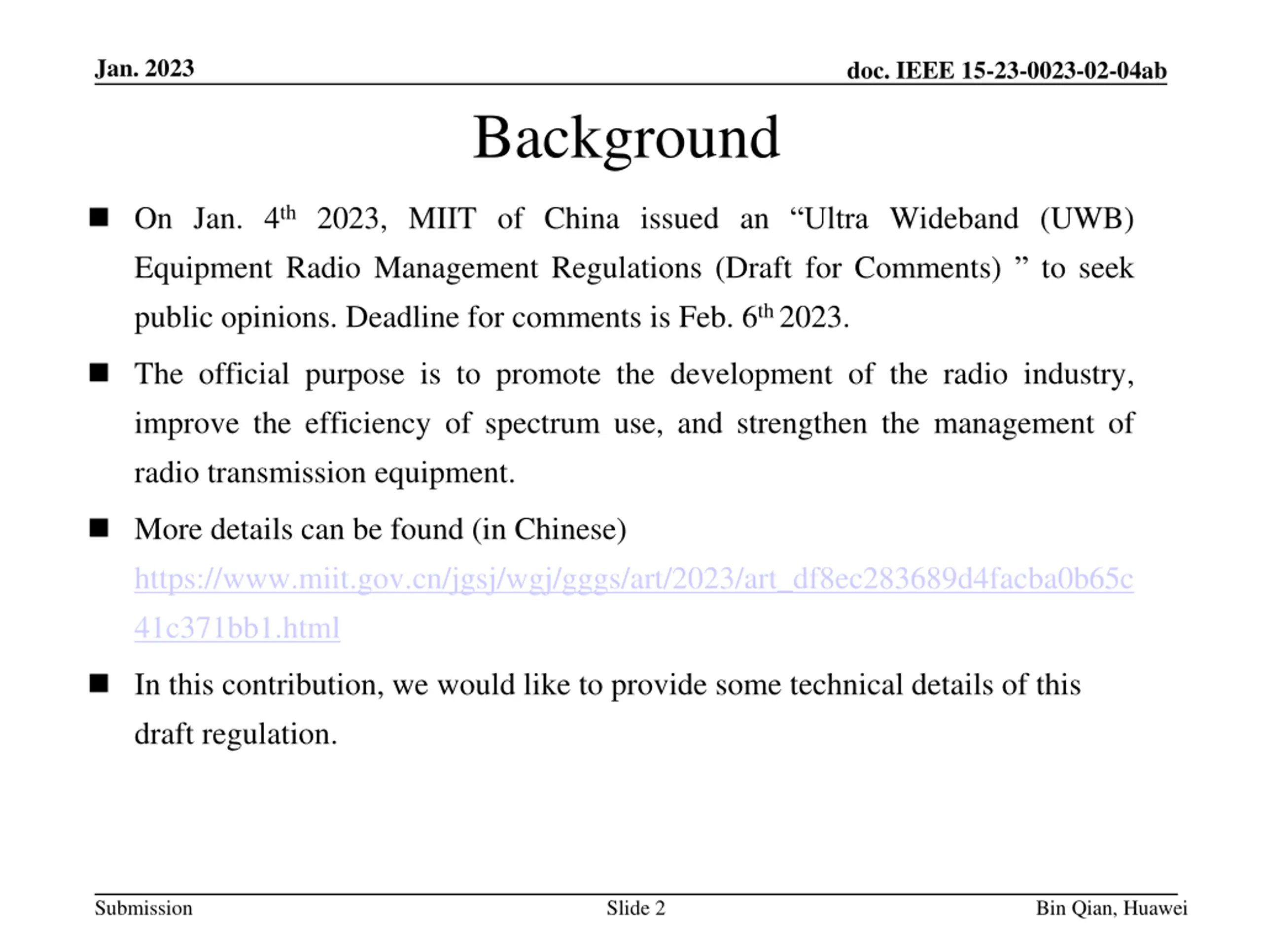 Jan. 2023 doc. IEEE 15-23-0023-02-04ab Background On Jan. 4th 2023, MIIT of China issued an Ultra Wideband (UWB) Equipment Radio Management Regulations (Draft for Comments) to seek public opinions. Deadline for comments is Feb. 6th 2023. The official purpose is to promote the development of the radio industry, improve the efficiency of spectrum use, and strengthen the management of radio transmission equipment. More details can be found (in Chinese) https://www.miit.gov.cn/jgsj/wgj/gggs/art/2023/art_df8ec283689d4facba0b65c 41c371bb1.html In this contribution, we would like to provide some technical details of this draft regulation. Submission Slide 2 Bin Qian, Huawei