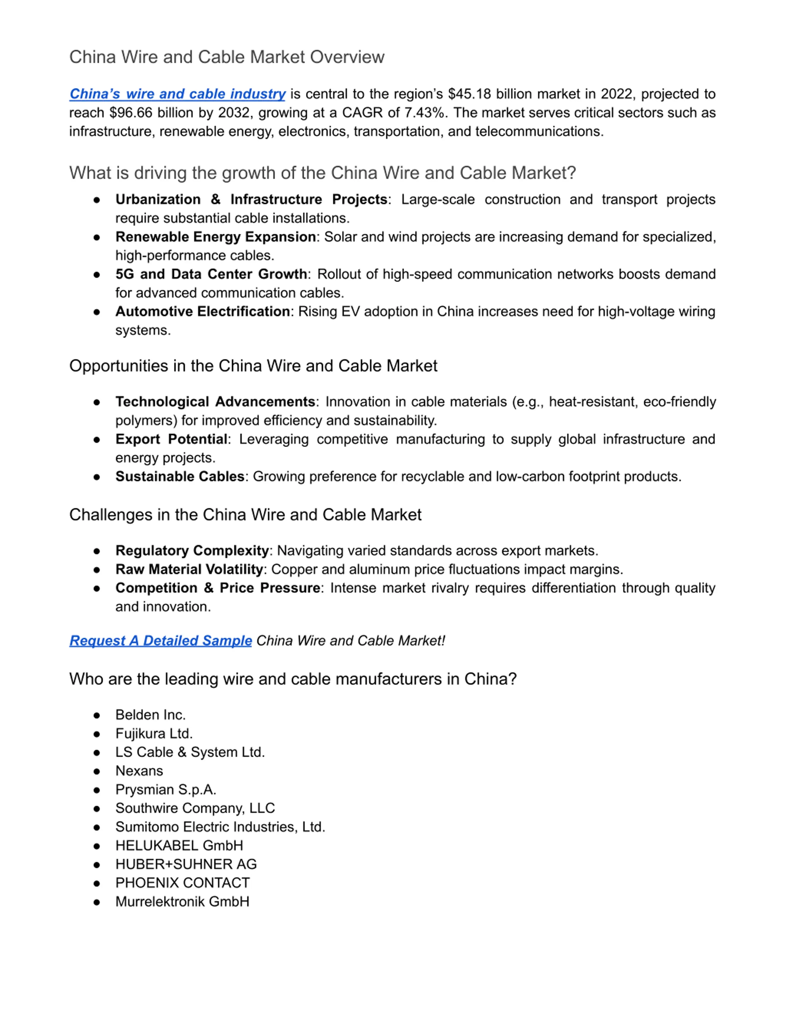 China Wire and Cable Market Overview China s wire and cable industry is central to the region s $45.18 billion market in 2022, projected to reach $96.66 billion by 2032, growing at a CAGR of 7.43%. The market serves critical sectors such as infrastructure, renewable energy, electronics, transportation, and telecommunications. What is driving the growth of the China Wire and Cable Market? Urbanization & Infrastructure Projects: Large-scale construction and transport projects require substantial cable installations. Renewable Energy Expansion: Solar and wind projects are increasing demand for specialized, high-performance cables. 5G and Data Center Growth: Rollout of high-speed communication networks boosts demand for advanced communication cables. Automotive Electrification: Rising EV adoption in China increases need for high-voltage wiring systems. Opportunities in the China Wire and Cable Market Technological Advancements: Innovation in cable materials (e.g., heat-resistant, eco-friendly polymers) for improved efficiency and sustainability. Export Potential: Leveraging competitive manufacturing to supply global infrastructure and energy projects. Sustainable Cables: Growing preference for recyclable and low-carbon footprint products. Challenges in the China Wire and Cable Market Regulatory Complexity: Navigating varied standards across export markets. Raw Material Volatility: Copper and aluminum price fluctuations impact margins. Competition & Price Pressure: Intense market rivalry requires differentiation through quality and innovation. Request A Detailed SampleChina Wire and Cable Market! Who are the leading wire and cable manufacturers in China? Belden Inc. Fujikura Ltd. LS Cable & System Ltd. Nexans Prysmian S.p.A. Southwire Company, LLC Sumitomo Electric Industries, Ltd. HELUKABEL GmbH HUBER+SUHNER AG PHOENIX CONTACT Murrelektronik GmbH