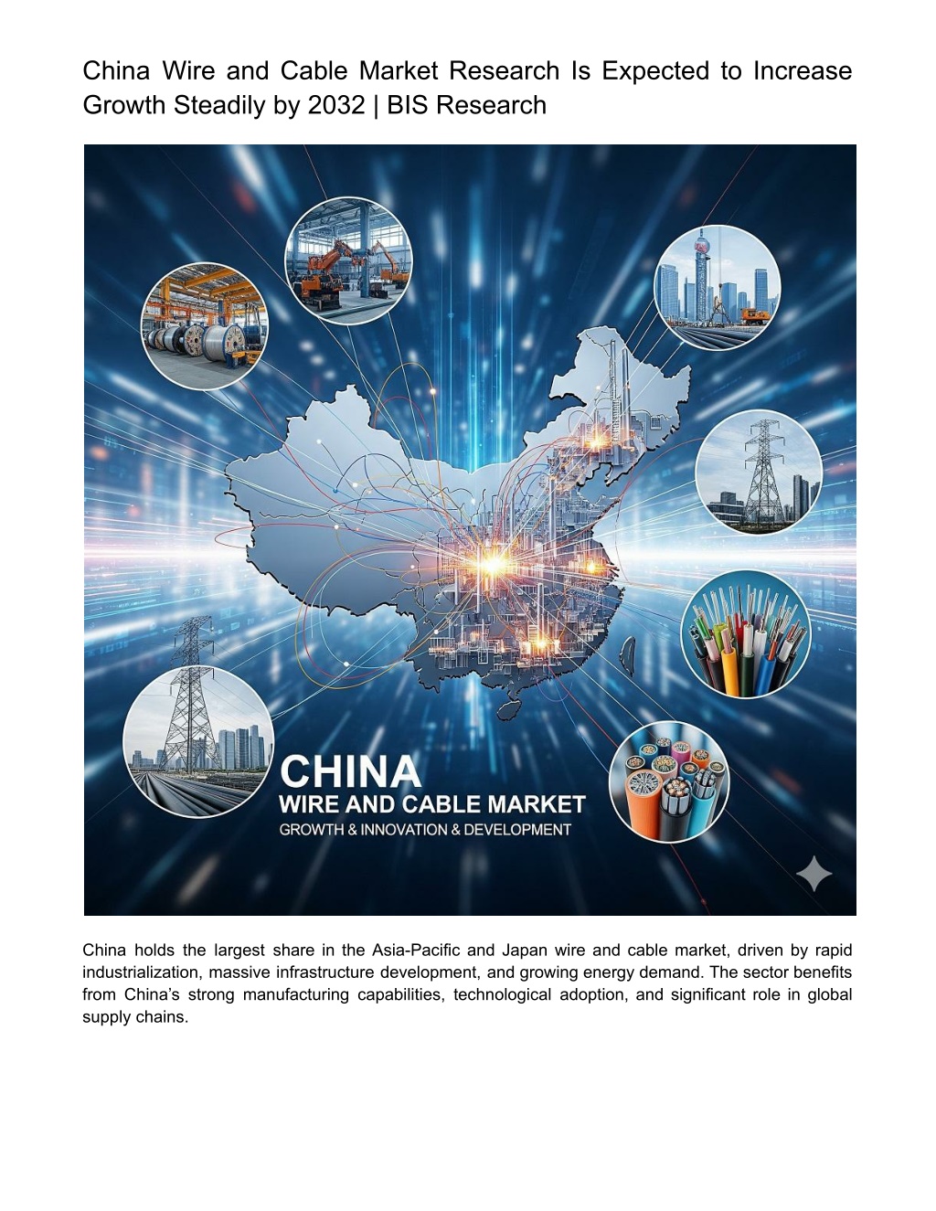 China Wire and Cable Market Research Is Expected to Increase Growth Steadily by 2032 | BIS Research China holds the largest share in the Asia-Pacific and Japan wire and cable market, driven by rapid industrialization, massive infrastructure development, and growing energy demand. The sector benefits from China s strong manufacturing capabilities, technological adoption, and significant role in global supply chains.
