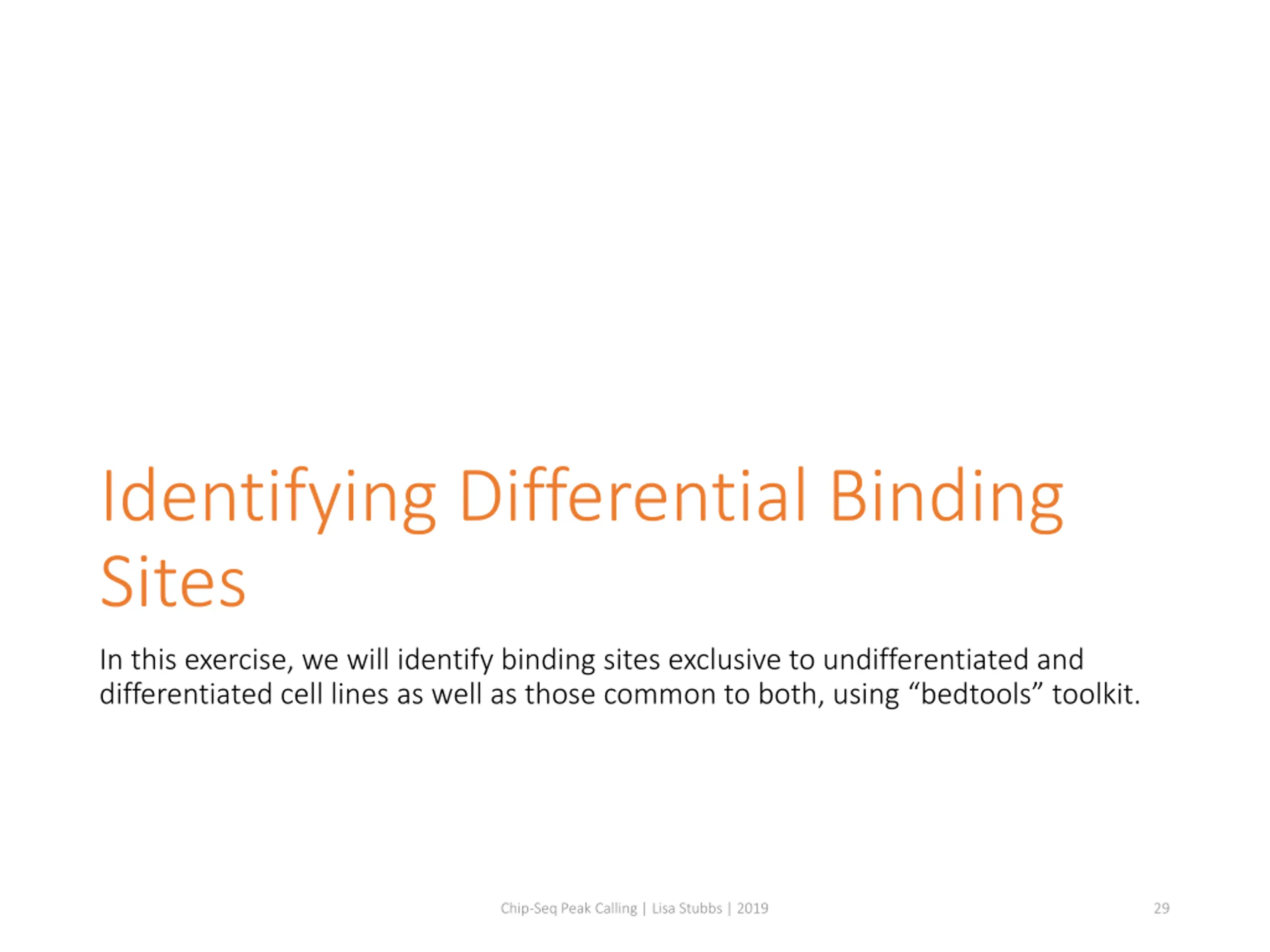 Identifying Differential Binding Sites In this exercise, we will identify binding sites exclusive to undifferentiated and differentiated cell lines as well as those common to both, using bedtools toolkit. Chip-Seq Peak Calling | Lisa Stubbs | 2019 29