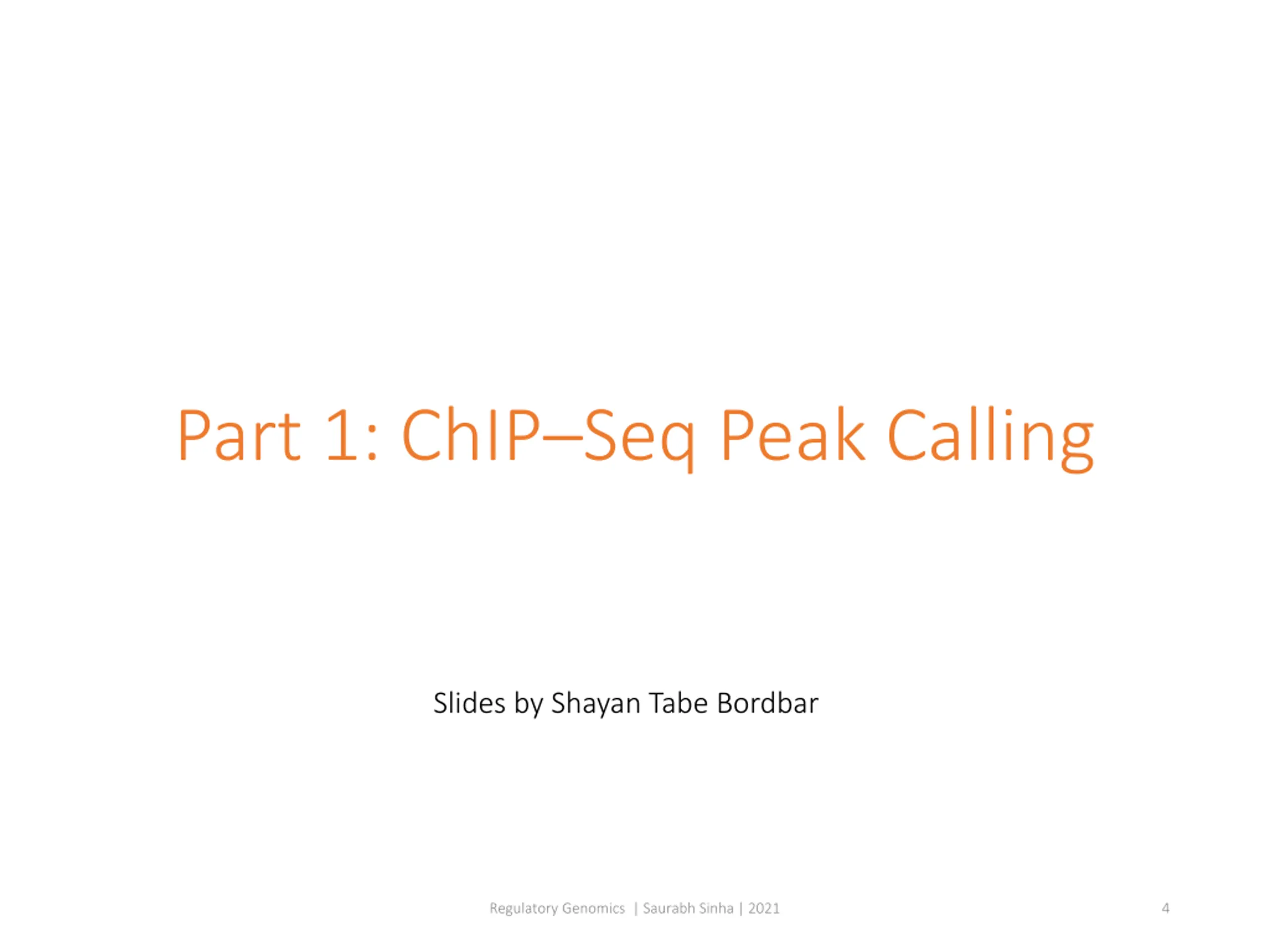 Part 1: ChIPSeq Peak Calling Slides by Shayan Tabe Bordbar Regulatory Genomics | Saurabh Sinha | 2021 4