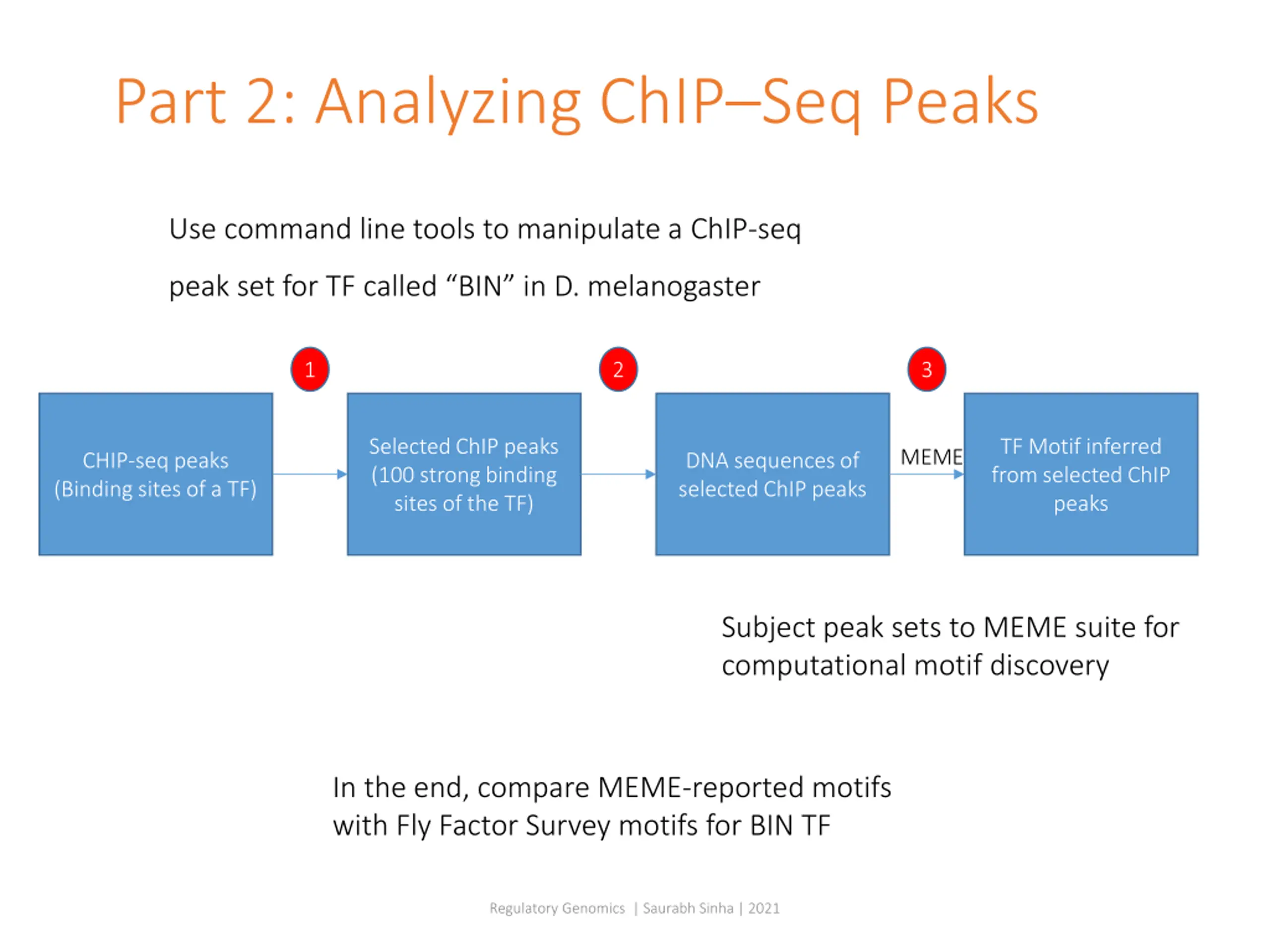 Part 2: Analyzing ChIPSeq Peaks Use command line tools to manipulate a ChIP-seq peak set for TF called BIN in D. melanogaster 1 2 3 Selected ChIP peaks (100 strong binding sites of the TF) TF Motif inferred from selected ChIP peaks MEME CHIP-seq peaks (Binding sites of a TF) DNA sequences of selected ChIP peaks Subject peak sets to MEME suite for computational motif discovery In the end, compare MEME-reported motifs with Fly Factor Survey motifs for BIN TF Regulatory Genomics | Saurabh Sinha | 2021