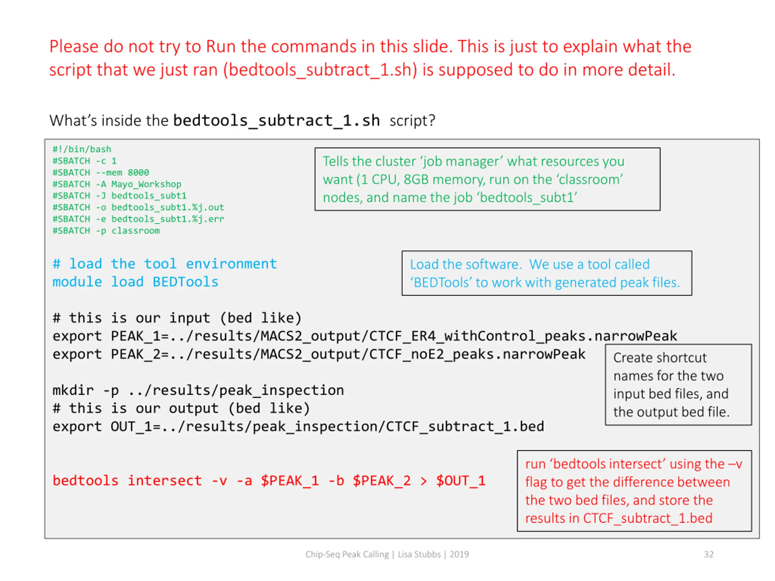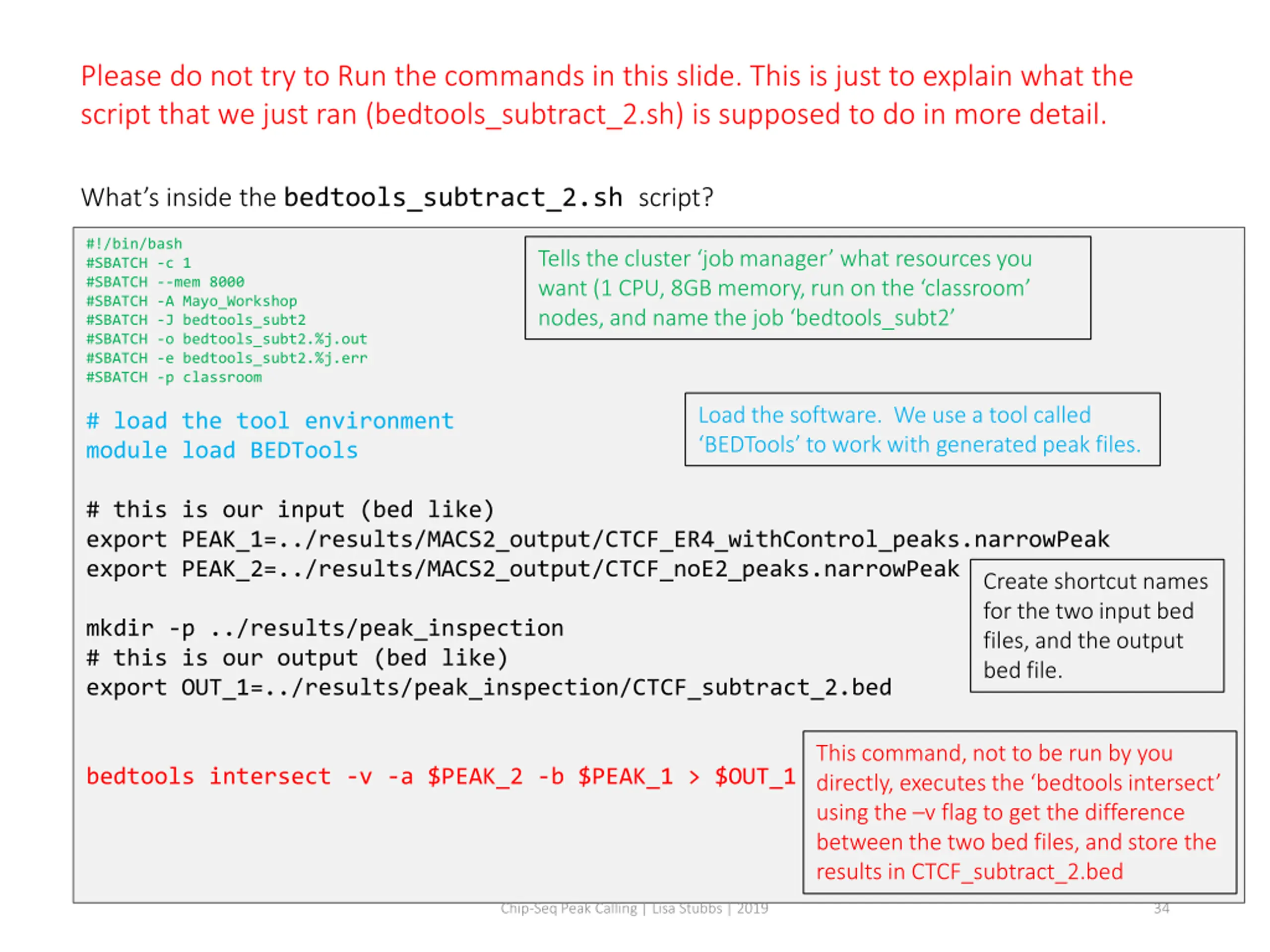 Please do not try to Run the commands in this slide. This is just to explain what the script that we just ran (bedtools_subtract_1.sh) is supposed to do in more detail. What s inside the bedtools_subtract_1.sh script? #!/bin/bash #SBATCH -c 1 #SBATCH --mem 8000 #SBATCH -A Mayo_Workshop #SBATCH -J bedtools_subt1 #SBATCH -o bedtools_subt1.%j.out #SBATCH -e bedtools_subt1.%j.err #SBATCH -p classroom Tells the cluster job manager what resources you want (1 CPU, 8GB memory, run on the classroom nodes, and name the job bedtools_subt1 # load the tool environment module load BEDTools Load the software. We use a tool called BEDTools to work with generated peak files. # this is our input (bed like) export PEAK_1=../results/MACS2_output/CTCF_ER4_withControl_peaks.narrowPeak export PEAK_2=../results/MACS2_output/CTCF_noE2_peaks.narrowPeak Create shortcut names for the two input bed files, and the output bed file. mkdir -p ../results/peak_inspection # this is our output (bed like) export OUT_1=../results/peak_inspection/CTCF_subtract_1.bed run bedtools intersect using the v flag to get the difference between the two bed files, and store the results in CTCF_subtract_1.bed bedtools intersect -v -a $PEAK_1 -b $PEAK_2 > $OUT_1 Chip-Seq Peak Calling | Lisa Stubbs | 2019 32