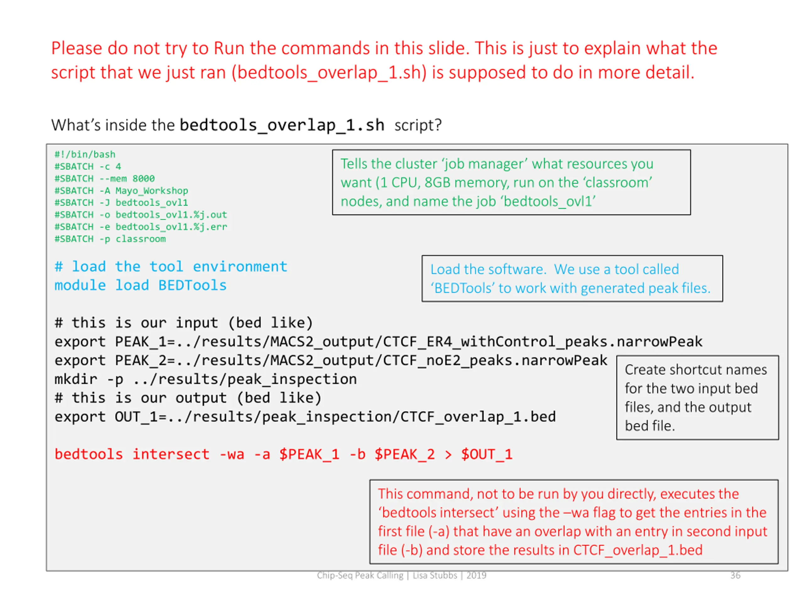 Please do not try to Run the commands in this slide. This is just to explain what the script that we just ran (bedtools_overlap_1.sh) is supposed to do in more detail. What s inside the bedtools_overlap_1.sh script? #!/bin/bash #SBATCH -c 4 #SBATCH --mem 8000 #SBATCH -A Mayo_Workshop #SBATCH -J bedtools_ovl1 #SBATCH -o bedtools_ovl1.%j.out #SBATCH -e bedtools_ovl1.%j.err #SBATCH -p classroom Tells the cluster job manager what resources you want (1 CPU, 8GB memory, run on the classroom nodes, and name the job bedtools_ovl1 # load the tool environment module load BEDTools Load the software. We use a tool called BEDTools to work with generated peak files. # this is our input (bed like) export PEAK_1=../results/MACS2_output/CTCF_ER4_withControl_peaks.narrowPeak export PEAK_2=../results/MACS2_output/CTCF_noE2_peaks.narrowPeak mkdir -p ../results/peak_inspection # this is our output (bed like) export OUT_1=../results/peak_inspection/CTCF_overlap_1.bed Create shortcut names for the two input bed files, and the output bed file. bedtools intersect -wa -a $PEAK_1 -b $PEAK_2 > $OUT_1 This command, not to be run by youdirectly, executes the bedtools intersect using the wa flag to get the entries in the first file (-a) that have an overlap with an entry in second input file (-b) and store the results in CTCF_overlap_1.bed Chip-Seq Peak Calling | Lisa Stubbs | 2019 36