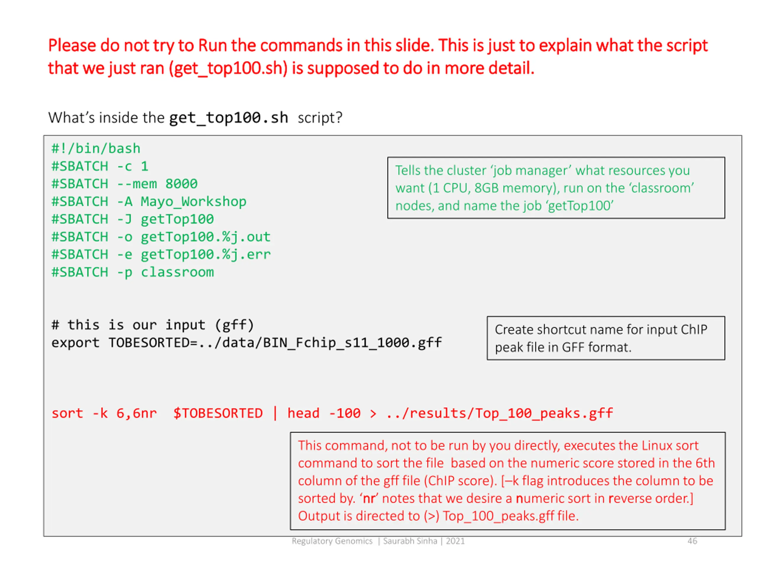 Please do not try to Run the commands in this slide. This is just to explain what the script Please do not try to Run the commands in this slide. This is just to explain what the script that we just ran (get_top100.sh) is supposed to do in more detail. that we just ran (get_top100.sh) is supposed to do in more detail. What s inside the get_top100.sh script? #!/bin/bash #SBATCH -c 1 #SBATCH --mem 8000 #SBATCH -A Mayo_Workshop #SBATCH -J getTop100 #SBATCH -o getTop100.%j.out #SBATCH -e getTop100.%j.err #SBATCH -p classroom Tells the cluster job manager what resources you want (1 CPU, 8GB memory), run on the classroom nodes, and name the job getTop100 # this is our input (gff) export TOBESORTED=../data/BIN_Fchip_s11_1000.gff Create shortcut name for input ChIP peak file in GFF format. sort -k 6,6nr $TOBESORTED | head -100 > ../results/Top_100_peaks.gff This command, not to be run by you directly, executes the Linux sort command to sort the file based on the numeric score stored in the 6th column of the gff file (ChIP score). [ k flag introduces the column to be sorted by. nr nr notes that we desire a n numeric sort in r reverse order.] Output is directed to (>) Top_100_peaks.gff file. Regulatory Genomics | Saurabh Sinha | 2021 46