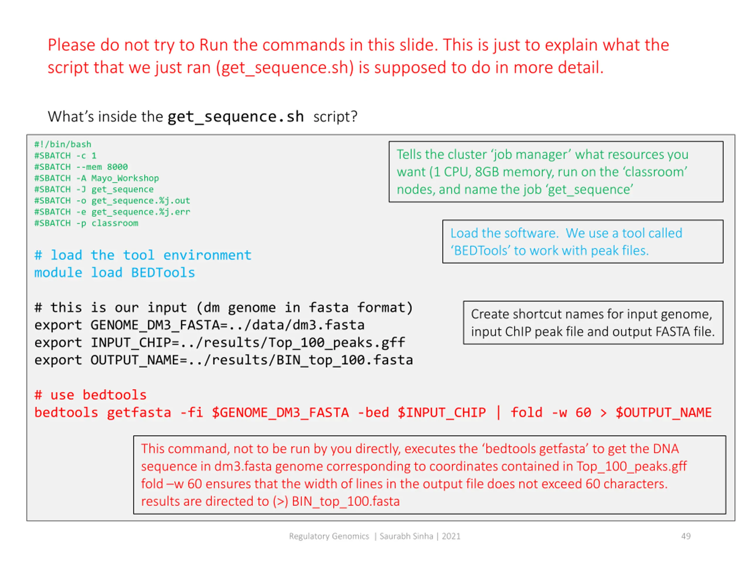 Please do not try to Run the commands in this slide. This is just to explain what the script that we just ran (get_sequence.sh) is supposed to do in more detail. What s inside the get_sequence.sh script? #!/bin/bash #SBATCH -c 1 #SBATCH --mem 8000 #SBATCH -A Mayo_Workshop #SBATCH -J get_sequence #SBATCH -o get_sequence.%j.out #SBATCH -e get_sequence.%j.err #SBATCH -p classroom Tells the cluster job manager what resources you want (1 CPU, 8GB memory, run on the classroom nodes, and name the job get_sequence Load the software. We use a tool called BEDTools to work with peak files. # load the tool environment module load BEDTools # this is our input (dm genome in fasta format) export GENOME_DM3_FASTA=../data/dm3.fasta export INPUT_CHIP=../results/Top_100_peaks.gff export OUTPUT_NAME=../results/BIN_top_100.fasta Create shortcut names for input genome, input ChIP peak file and output FASTA file. # use bedtools bedtools getfasta -fi $GENOME_DM3_FASTA -bed $INPUT_CHIP | fold -w 60 > $OUTPUT_NAME This command, not to be run by you directly, executes the bedtools getfasta to get the DNA sequence in dm3.fasta genome corresponding to coordinates contained in Top_100_peaks.gff fold w 60 ensures that the width of lines in the output file does not exceed 60 characters. results are directed to (>) BIN_top_100.fasta Regulatory Genomics | Saurabh Sinha | 2021 49