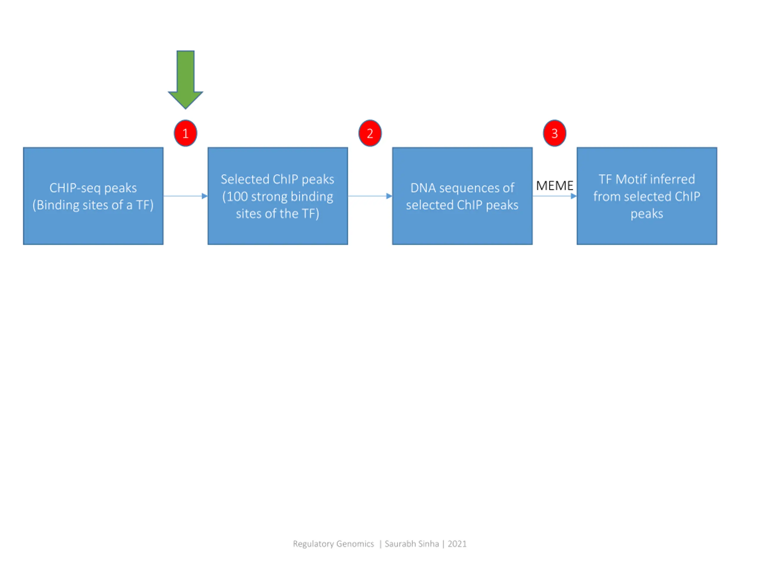 1 2 3 Selected ChIP peaks (100 strong binding sites of the TF) TF Motif inferred from selected ChIP peaks MEME CHIP-seq peaks (Binding sites of a TF) DNA sequences of selected ChIP peaks Regulatory Genomics | Saurabh Sinha | 2021