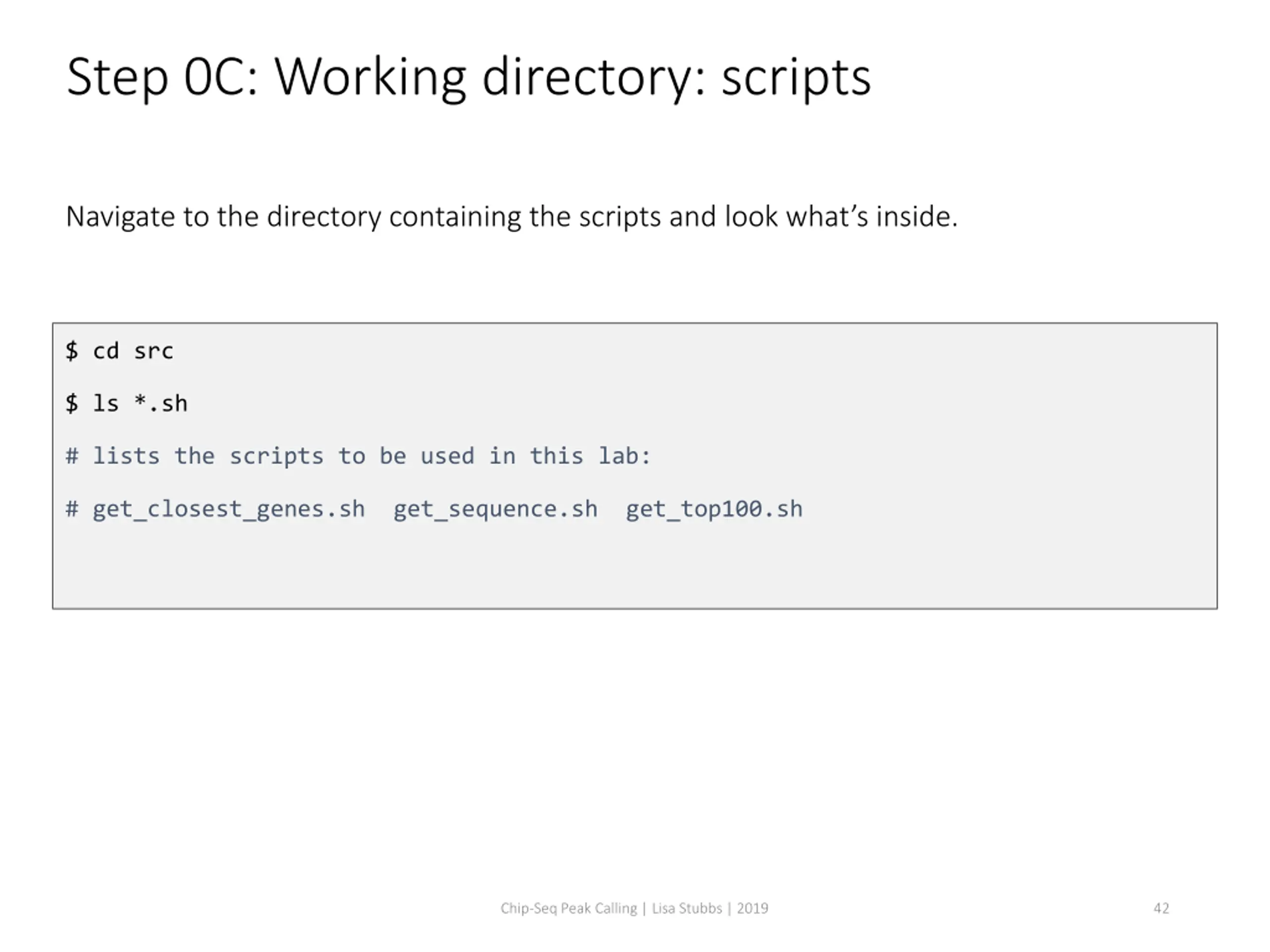 Step 0C: Working directory: scripts Navigate to the directory containing the scripts and look what s inside. $ cd src $ ls *.sh # lists the scripts to be used in this lab: # get_closest_genes.sh get_sequence.sh get_top100.sh Chip-Seq Peak Calling | Lisa Stubbs | 2019 42