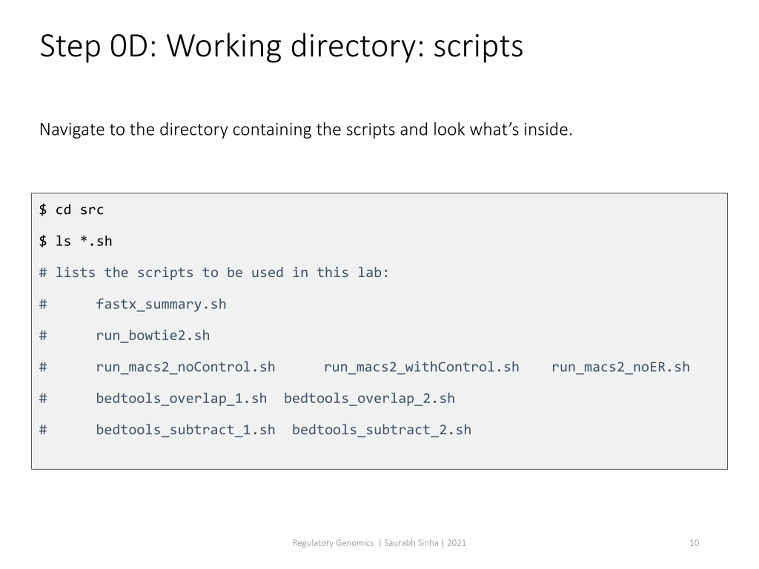 Step 0D: Working directory: scripts Navigate to the directory containing the scripts and look what s inside. $ cd src $ ls *.sh # lists the scripts to be used in this lab: # fastx_summary.sh # run_bowtie2.sh # run_macs2_noControl.sh run_macs2_withControl.sh run_macs2_noER.sh # bedtools_overlap_1.sh bedtools_overlap_2.sh # bedtools_subtract_1.sh bedtools_subtract_2.sh Regulatory Genomics | Saurabh Sinha | 2021 10