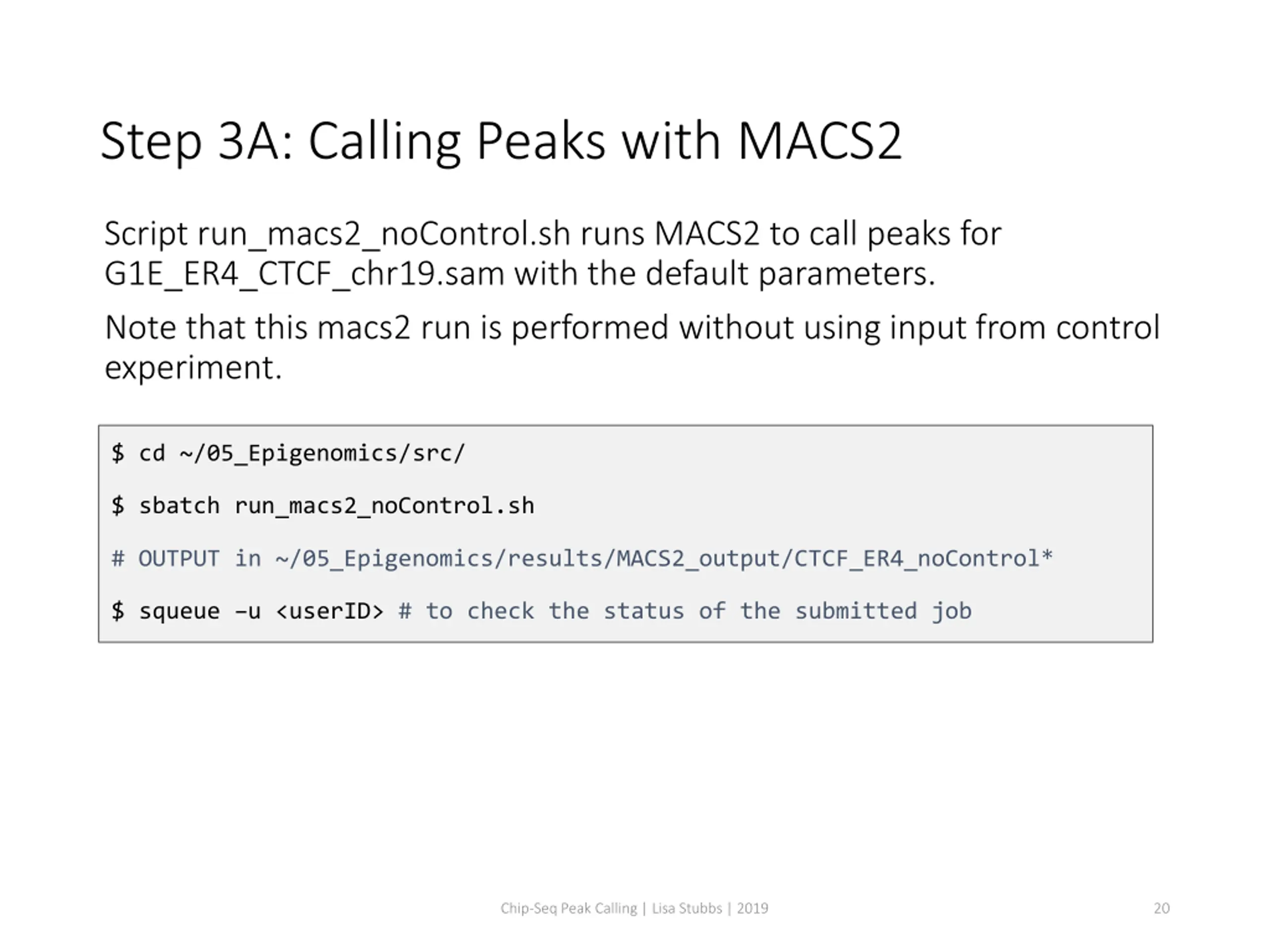 Step 3A: Calling Peaks with MACS2 Script run_macs2_noControl.sh runs MACS2 to call peaks for G1E_ER4_CTCF_chr19.sam with the default parameters. Note that this macs2 run is performed without using input from control experiment. $ cd ~/05_Epigenomics/src/ $ sbatch run_macs2_noControl.sh # OUTPUT in ~/05_Epigenomics/results/MACS2_output/CTCF_ER4_noControl* $ squeue u <userID> # to check the status of the submitted job Chip-Seq Peak Calling | Lisa Stubbs | 2019 20